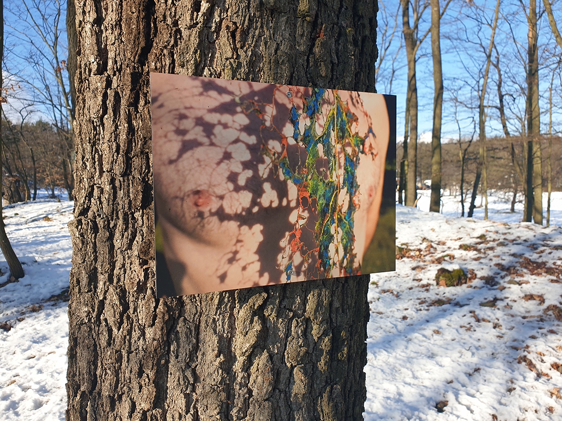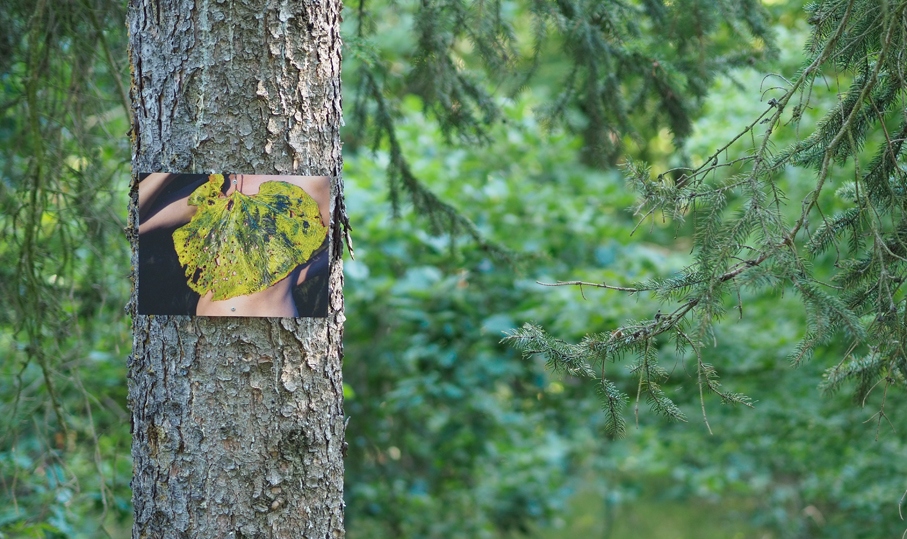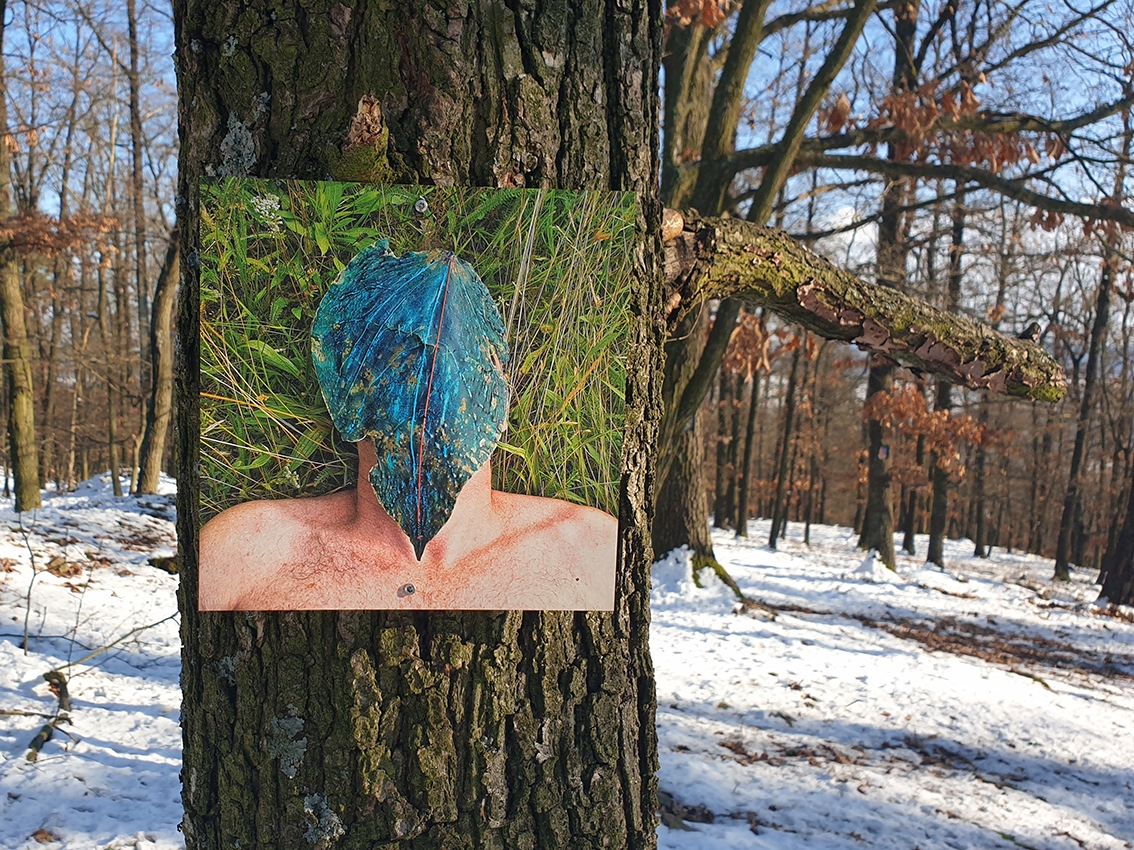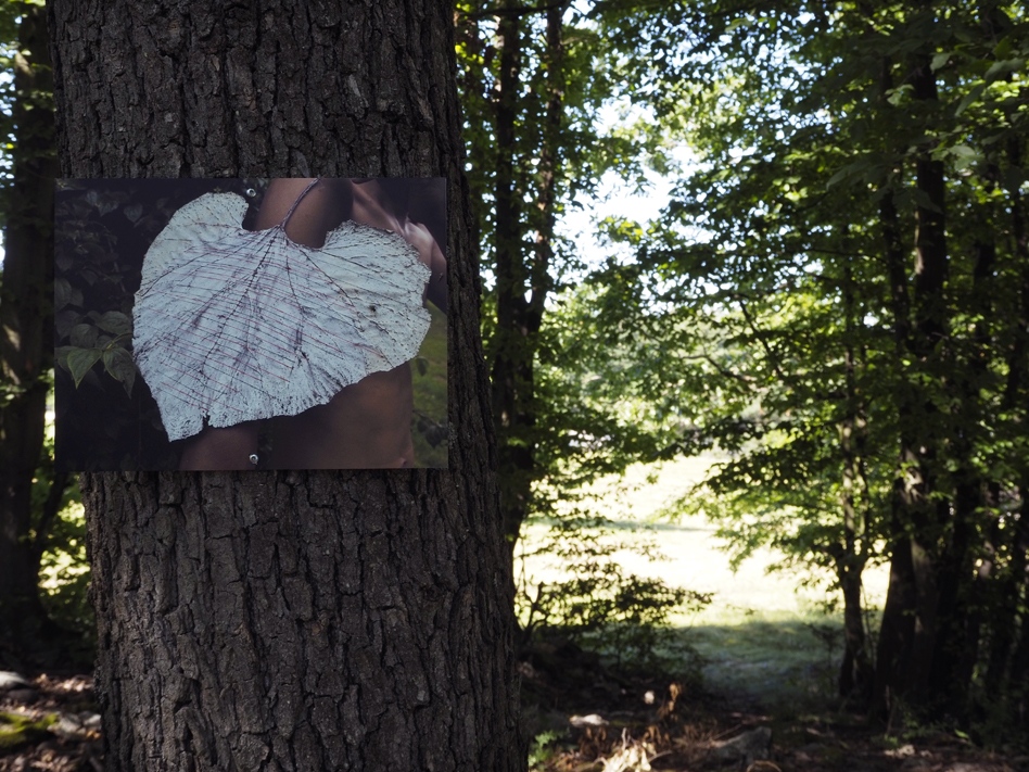Im „Wald der Blatthäuter“ sind in einem Waldstück inszenierte Fotografien von Blättern und Menschen aus der Serie „Skins and Leaves“ installiert. Großformatige Blattscapes bedecken menschliche Körper, deren BesitzerInnen ihre Identität zu verbergen und zu verlieren scheinen. BesucherInnen werden Teil eines magischpoetischen Versteckspiels der Körper, Blätter und Blicke. Es entsteht eine intimer Dialog der Texturen von Rinde, Haut -, Licht und Schatten, ein neuer Sinnzusammenhang zwischen Mensch und Natur.