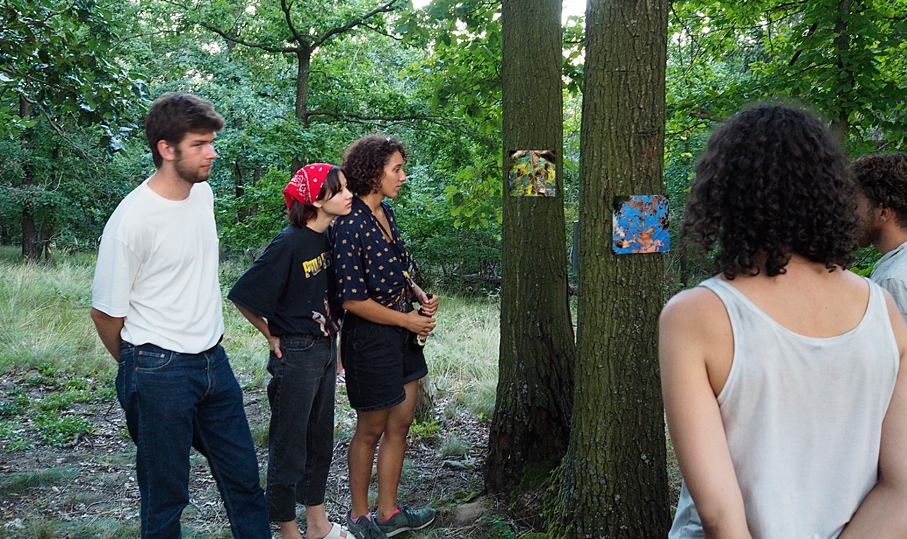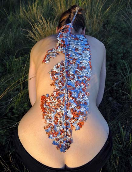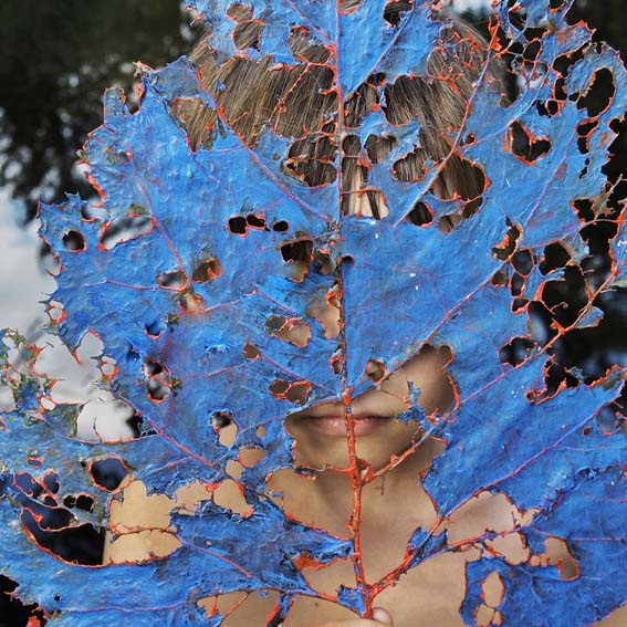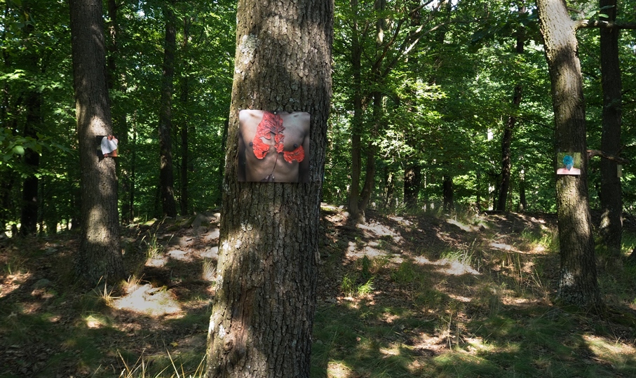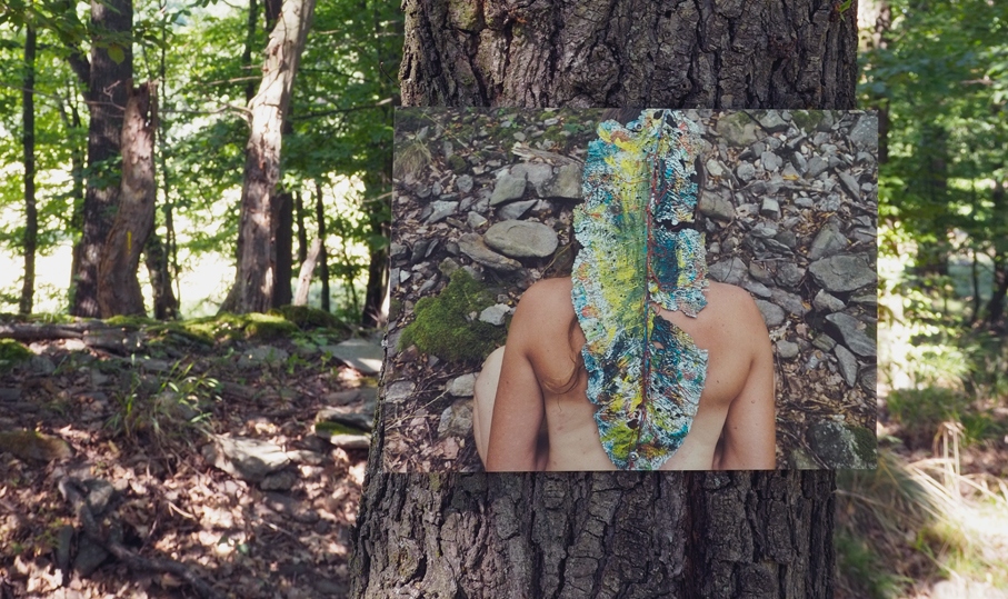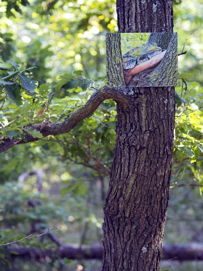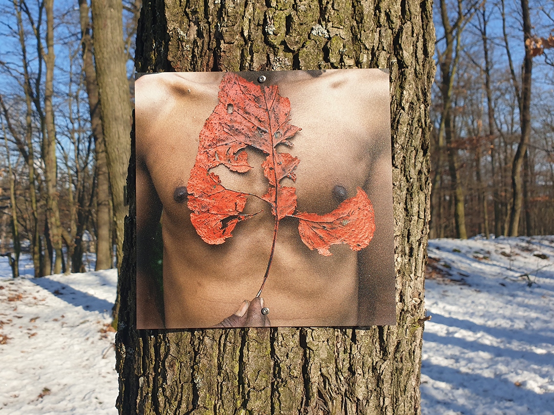 Im „Wald der Blatthäuter“ sind in einem Waldstück inszenierte Fotografien von Blättern und Menschen aus der Serie „Skins and Leaves“ installiert. Großformatige Blattscapes bedecken menschliche Körper, deren BesitzerInnen ihre Identität zu verbergen und zu verlieren scheinen. BesucherInnen werden Teil eines magischpoetischen Versteckspiels der Körper, Blätter und Blicke. Es entsteht eine intimer Dialog der Texturen von Rinde, Haut -, Licht und Schatten, ein neuer Sinnzusammenhang zwischen Mensch und Natur.