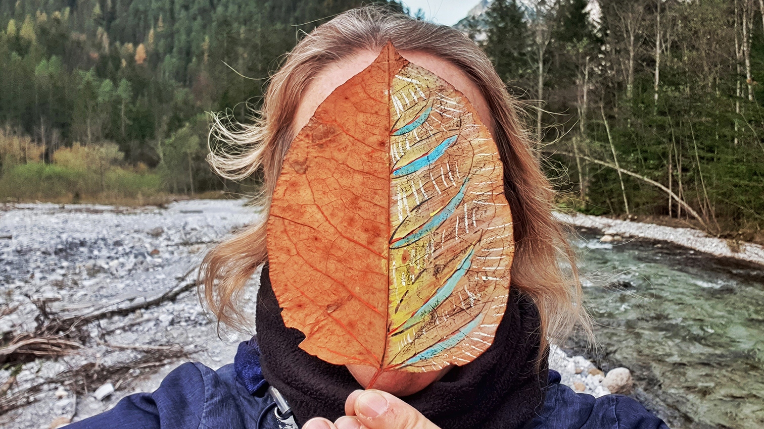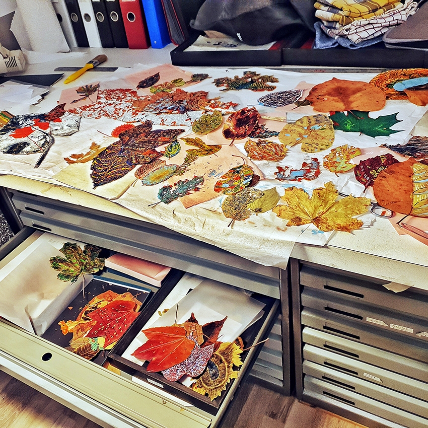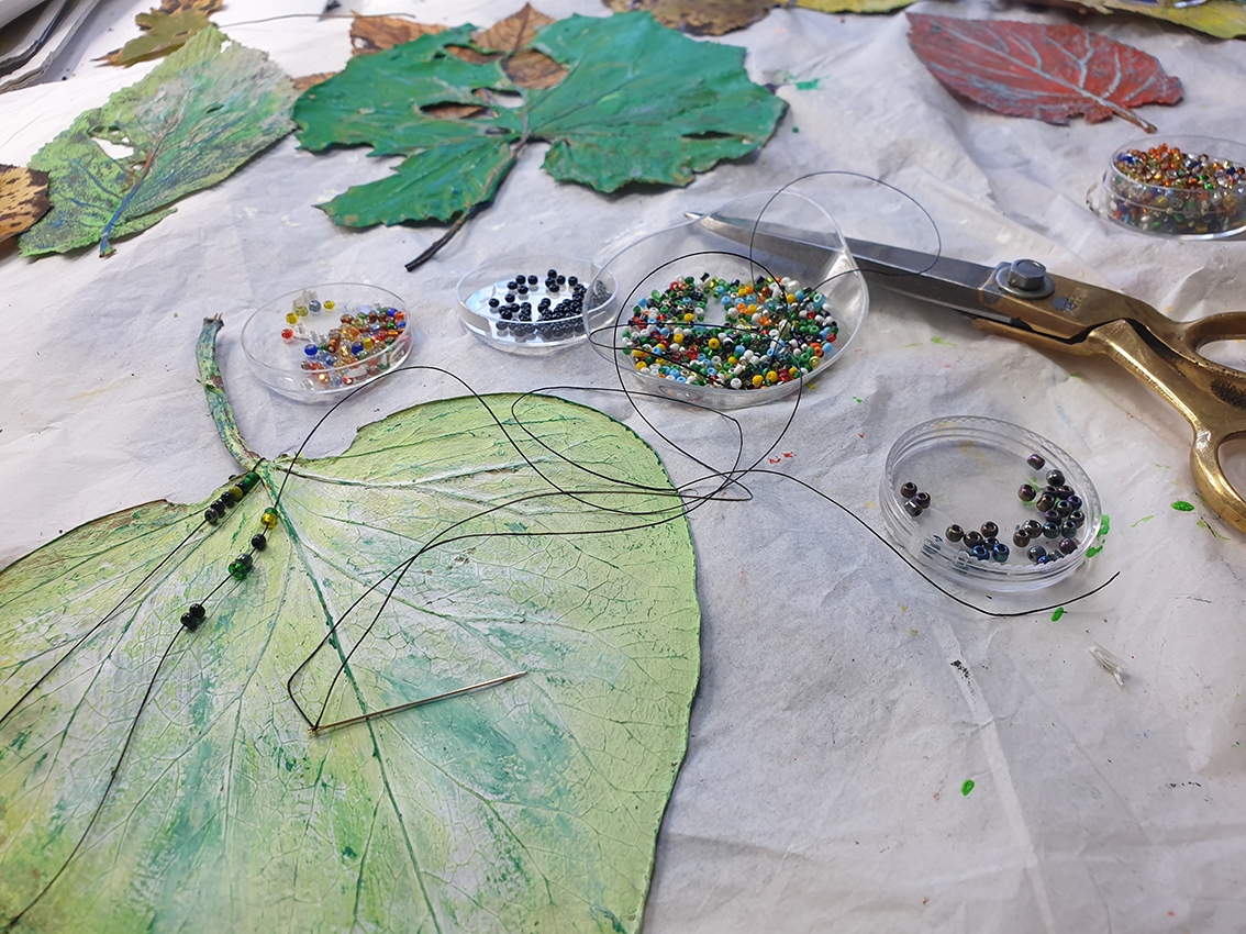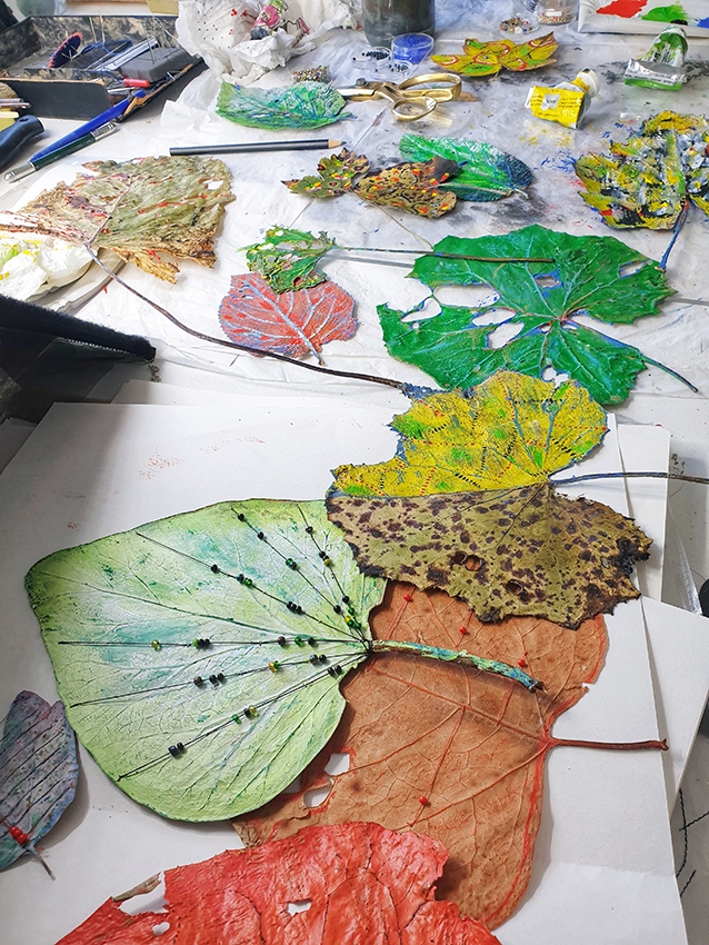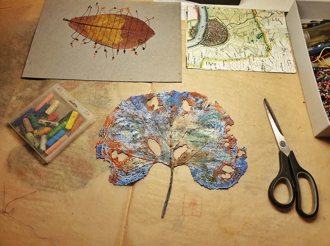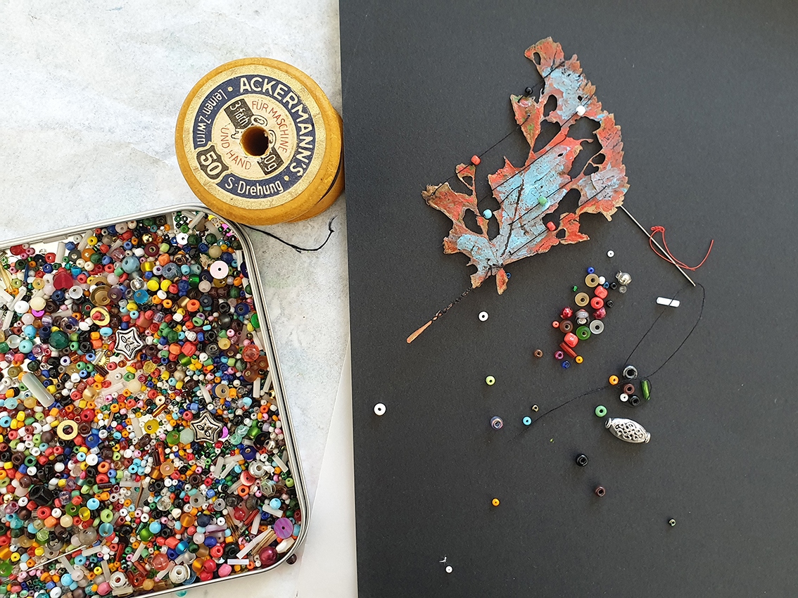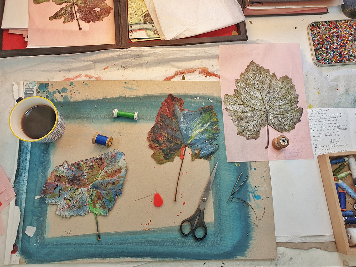 Die Künstlerin lebt in unmittelbarer Nähe der Klosterneuburger Donau-Au. Dort sammelt sie unterschiedliche Blätter, die das Ausgangsmaterial für ihre Arbeit bilden. Sie trocknet, presst und bearbeitet sie mit Acryl, Garn und Perlen.