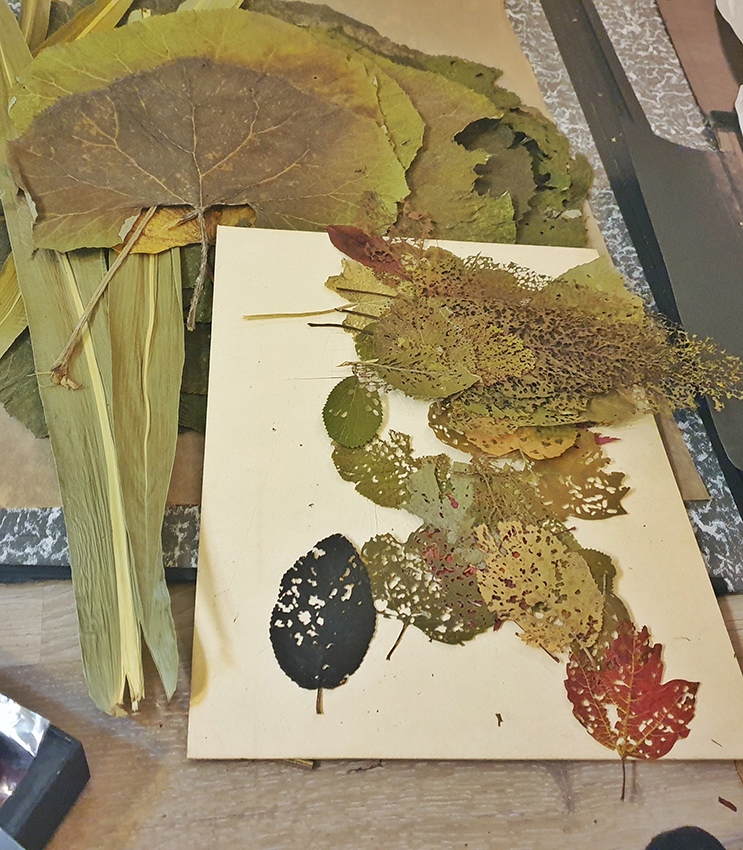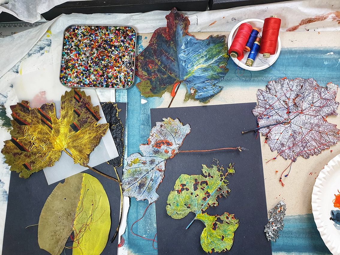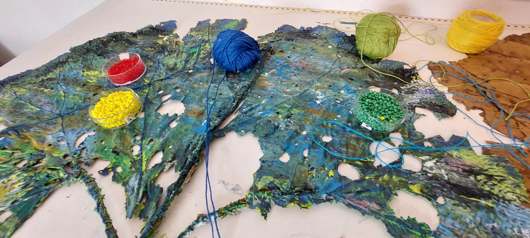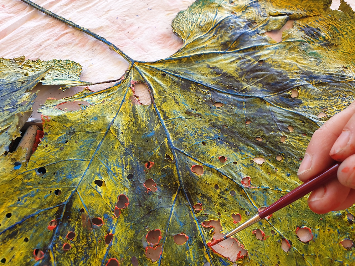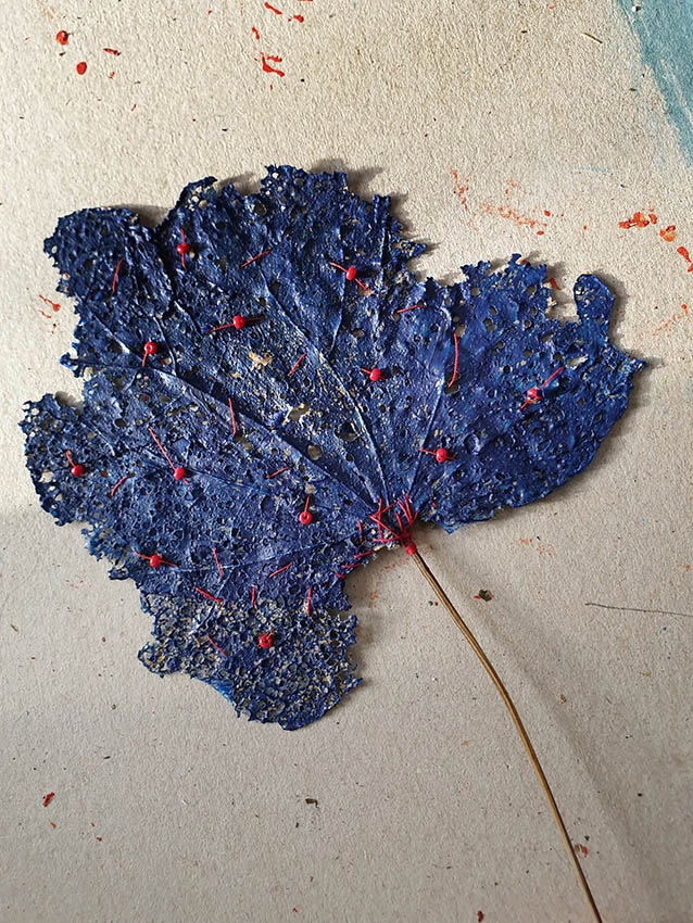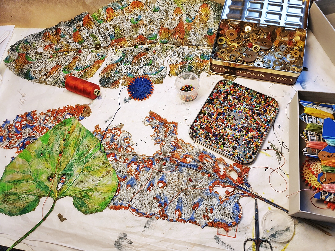 Die Künstlerin lebt in unmittelbarer Nähe der Klosterneuburger Donau-Au. Dort sammelt sie unterschiedliche Blätter, die das Ausgangsmaterial für ihre Arbeit bilden. Sie trocknet, presst und bearbeitet sie mit Acryl, Garn und Perlen.