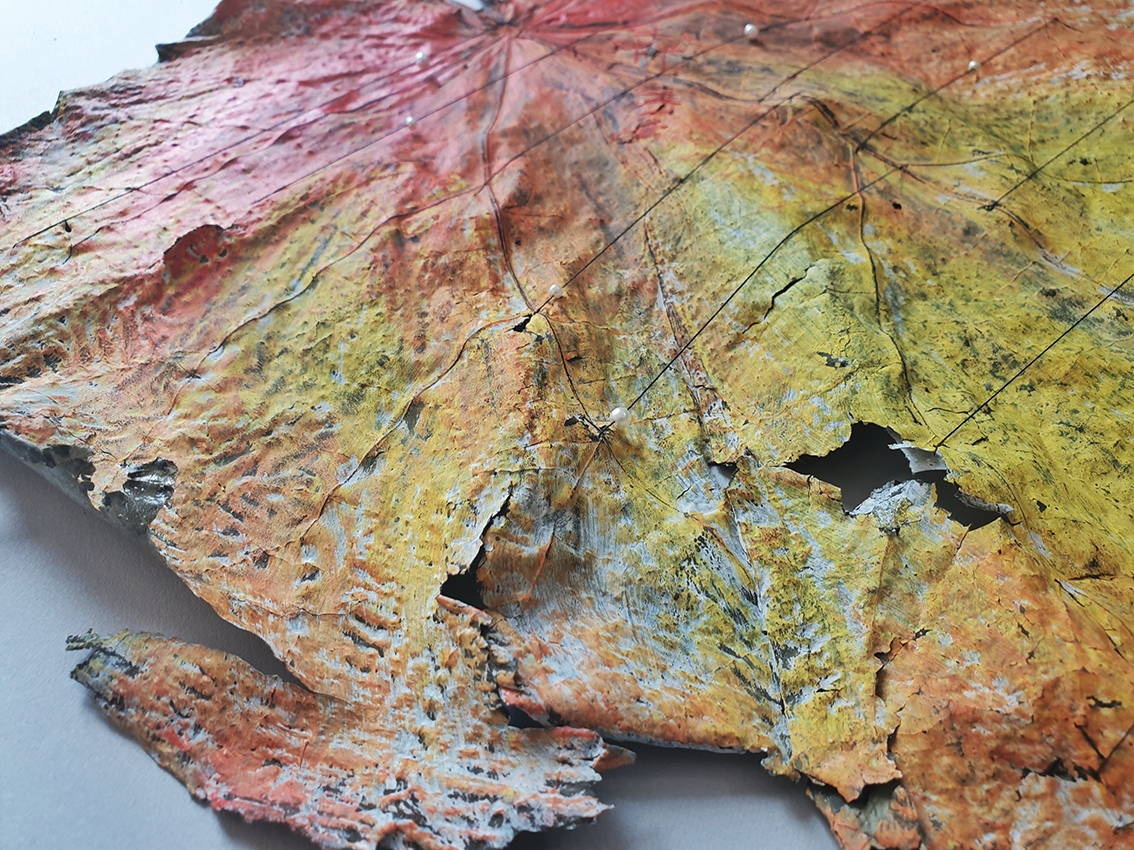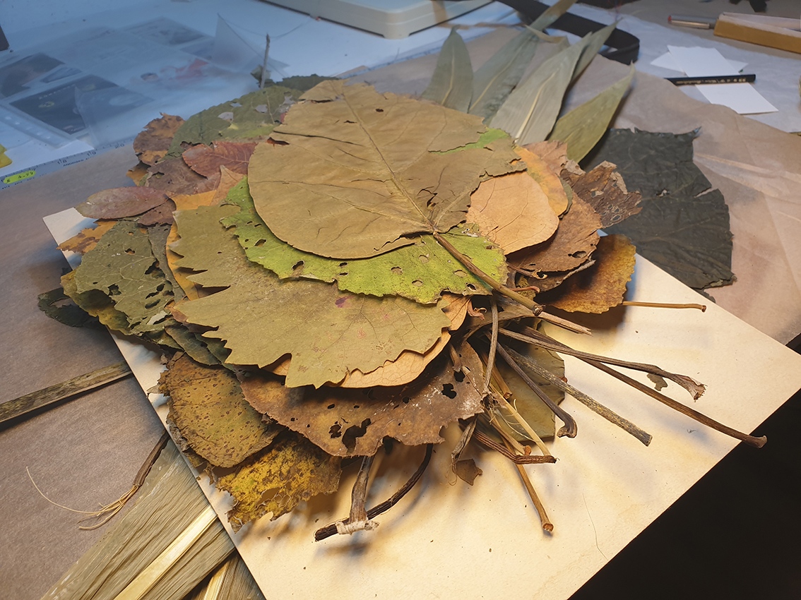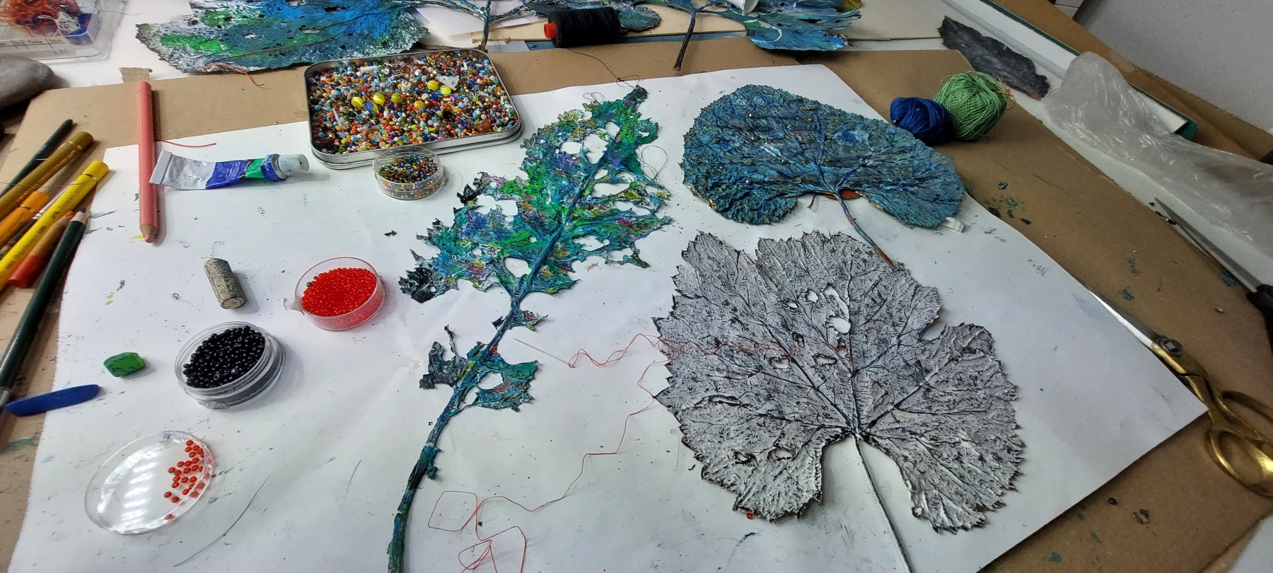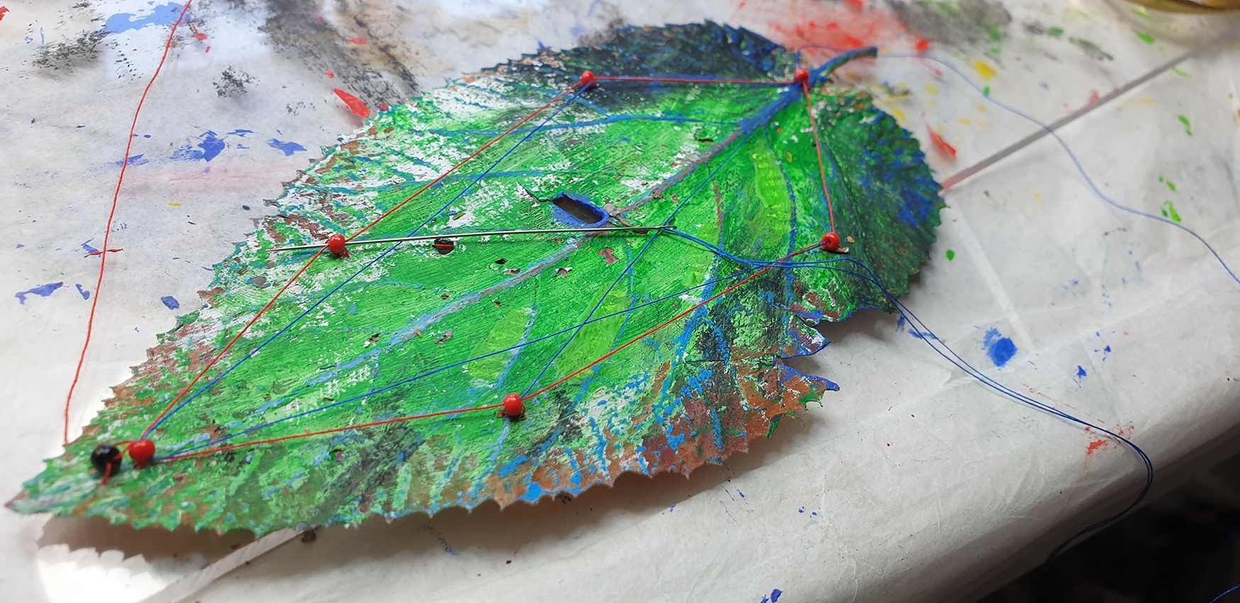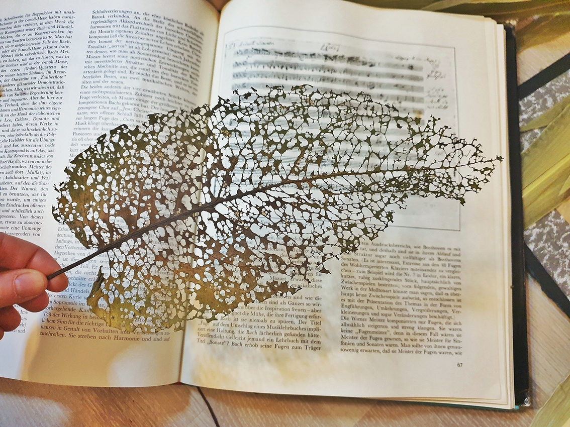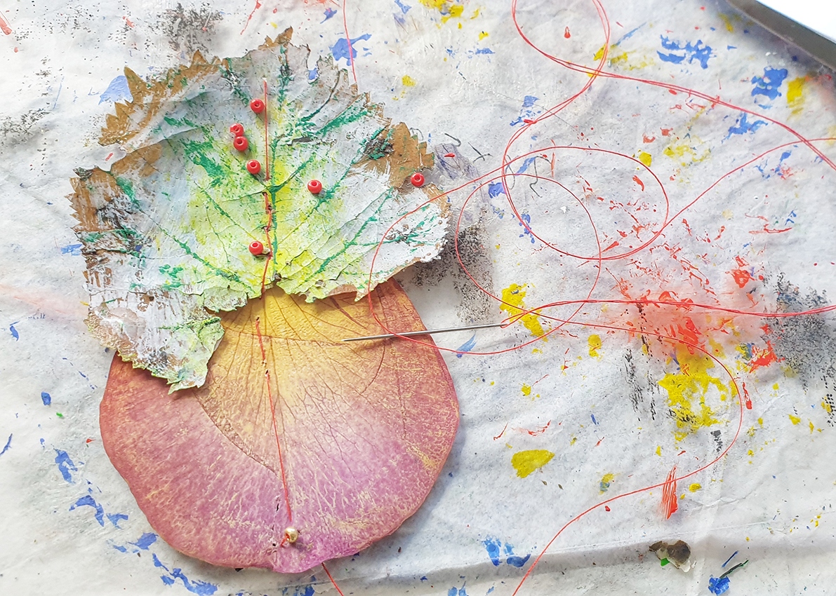 Die Künstlerin lebt in unmittelbarer Nähe der Klosterneuburger Donau-Au. Dort sammelt sie unterschiedliche Blätter, die das Ausgangsmaterial für ihre Arbeit bilden. Sie trocknet, presst und bearbeitet sie mit Acryl, Garn und Perlen.