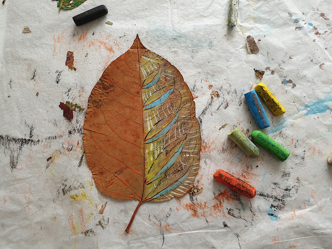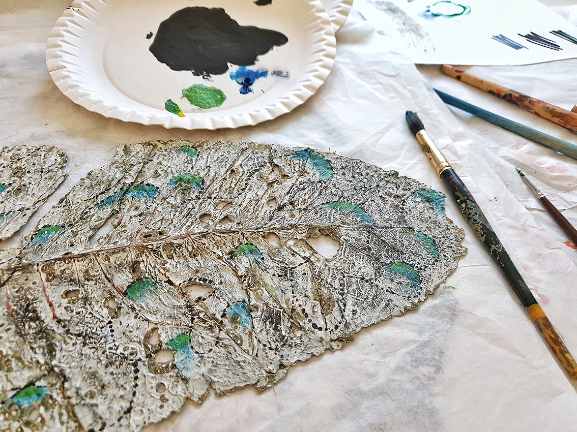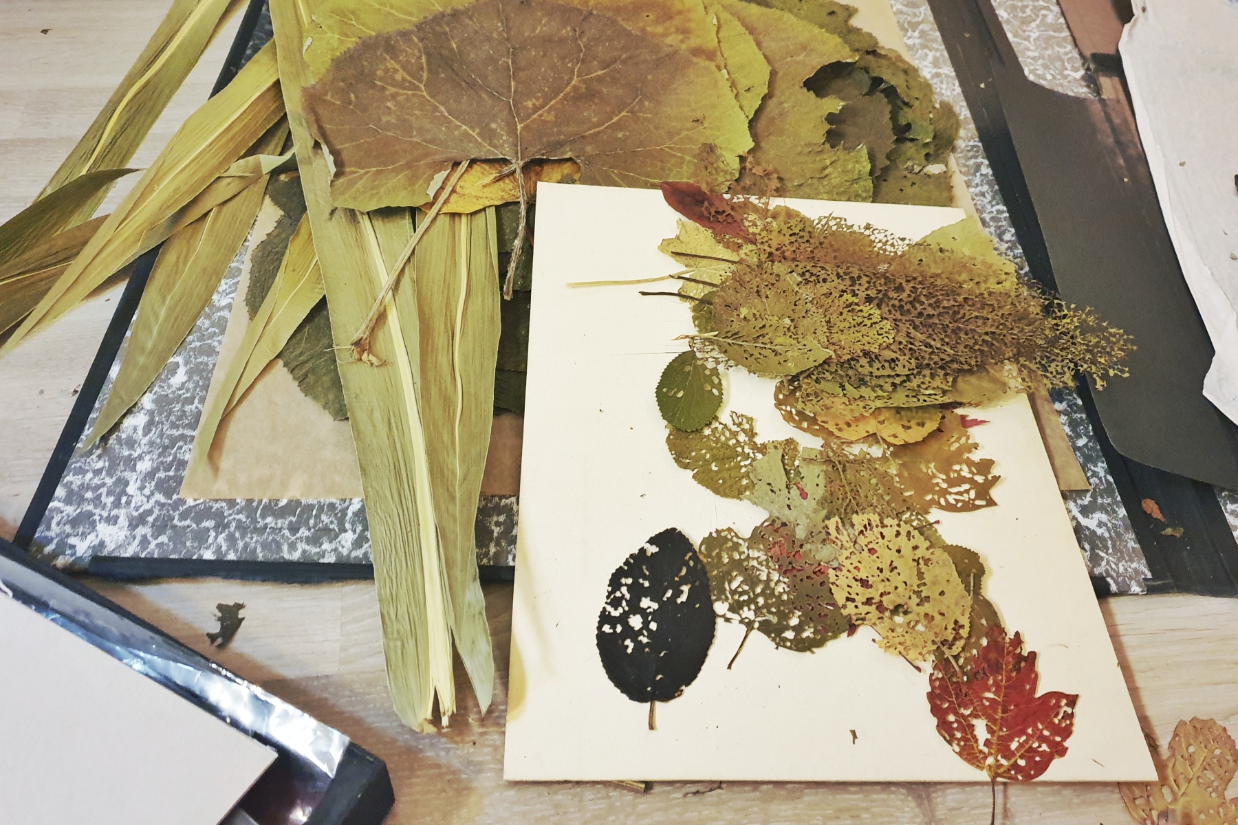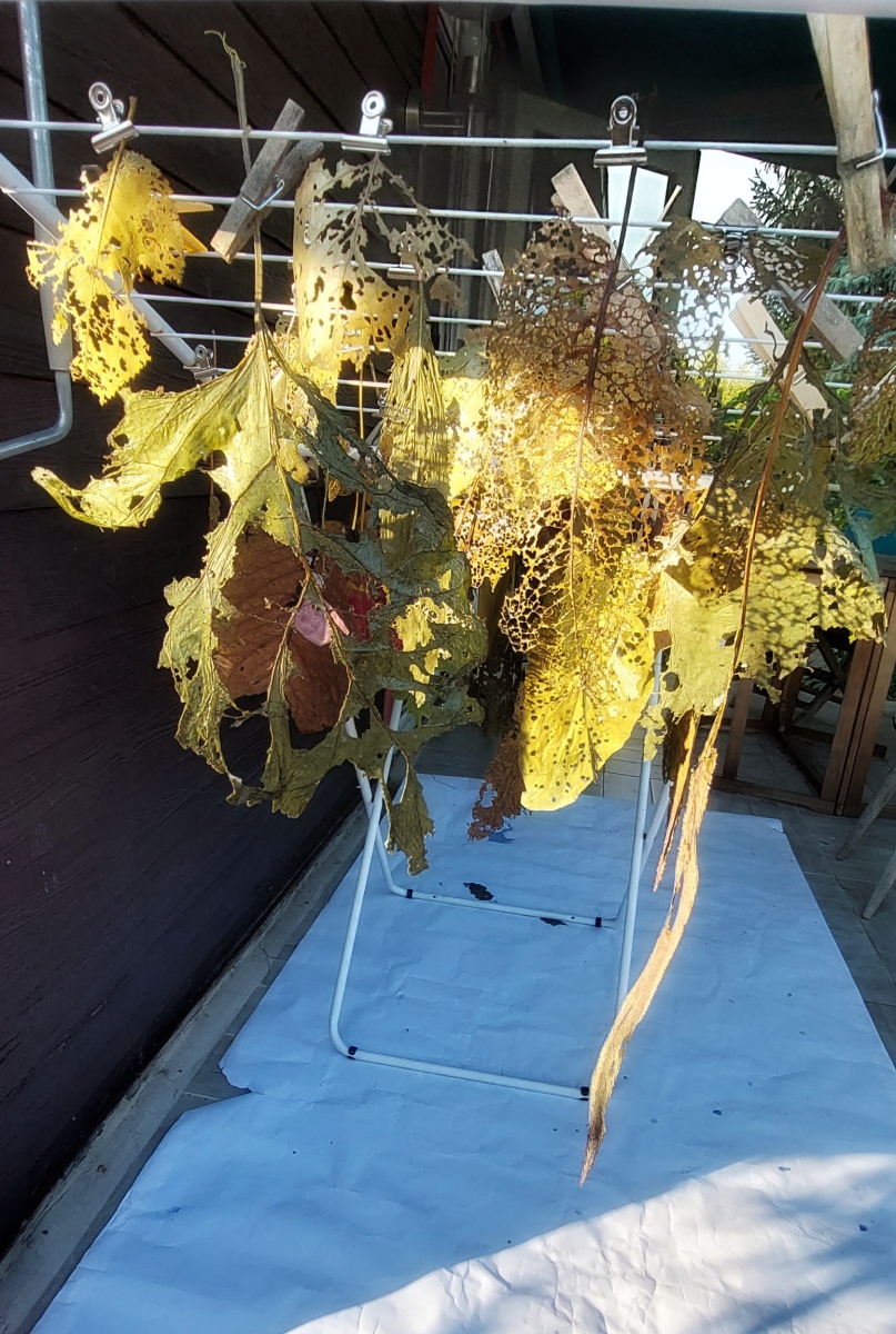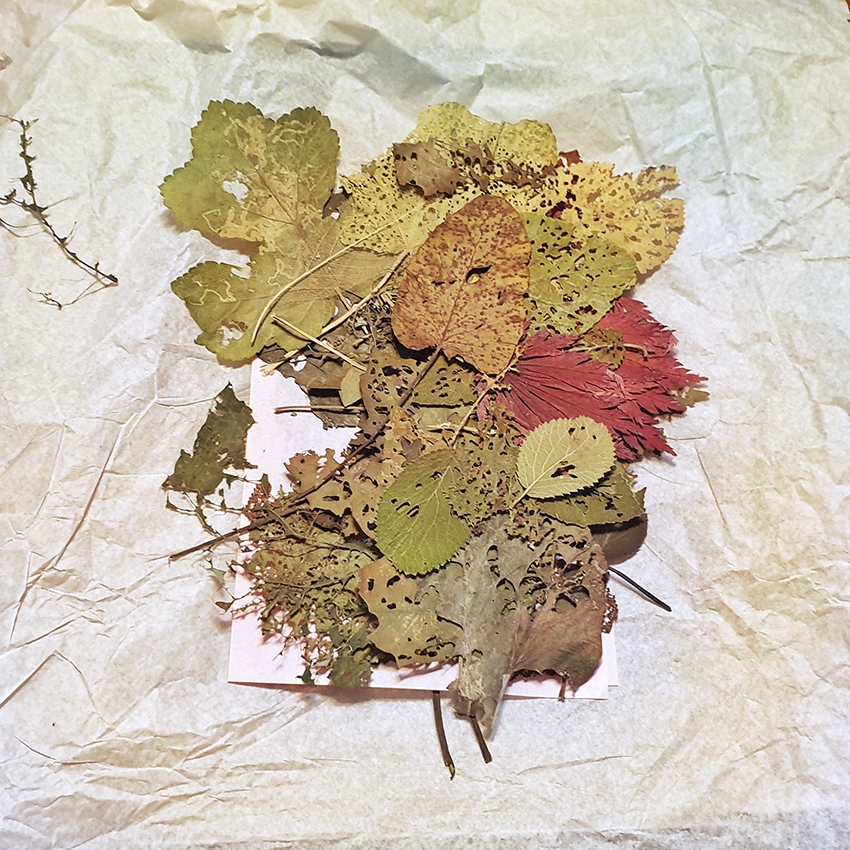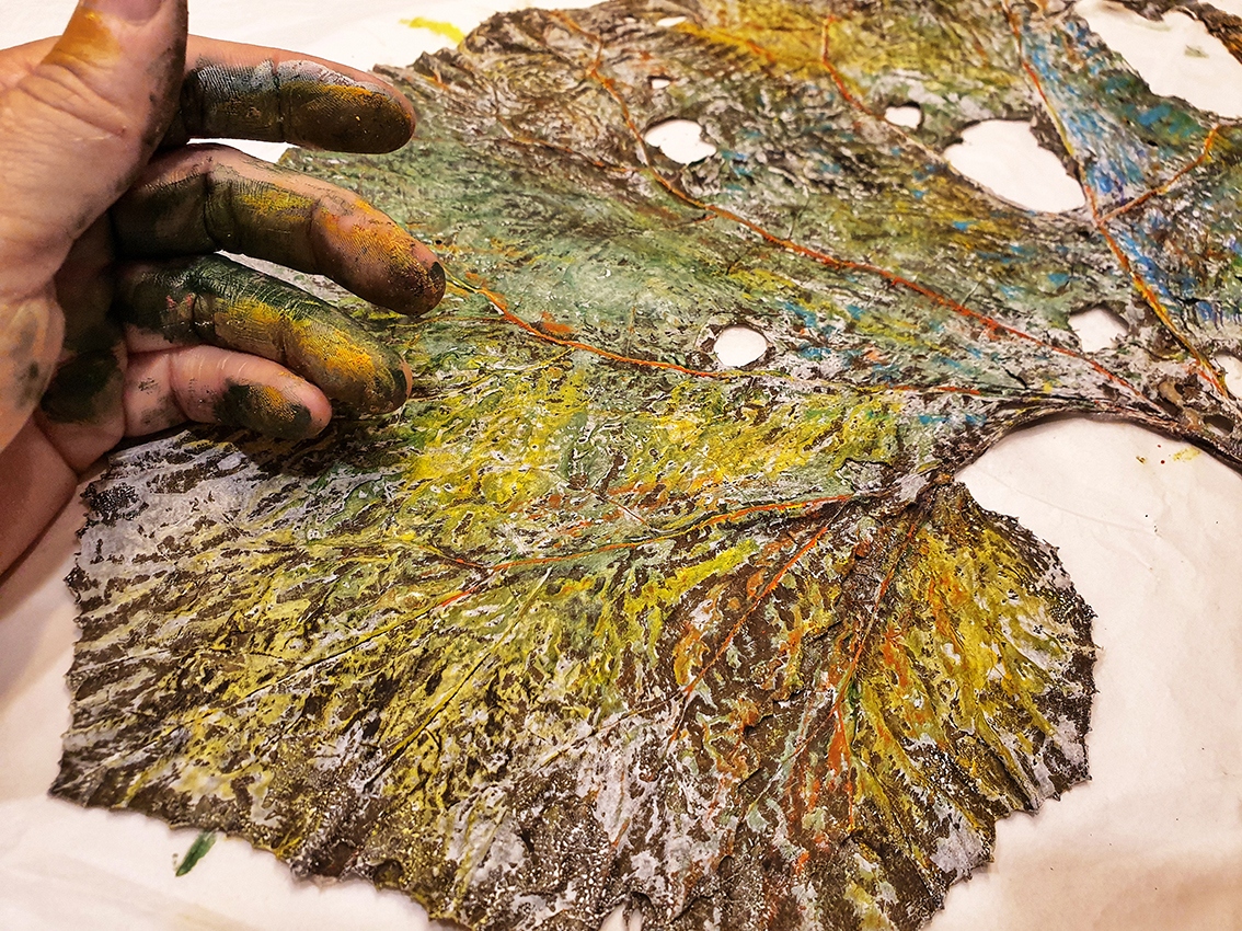 Die Künstlerin lebt in unmittelbarer Nähe der Klosterneuburger Donau-Au. Dort sammelt sie unterschiedliche Blätter, die das Ausgangsmaterial für ihre Arbeit bilden. Sie trocknet, presst und bearbeitet sie mit Acryl, Garn und Perlen.