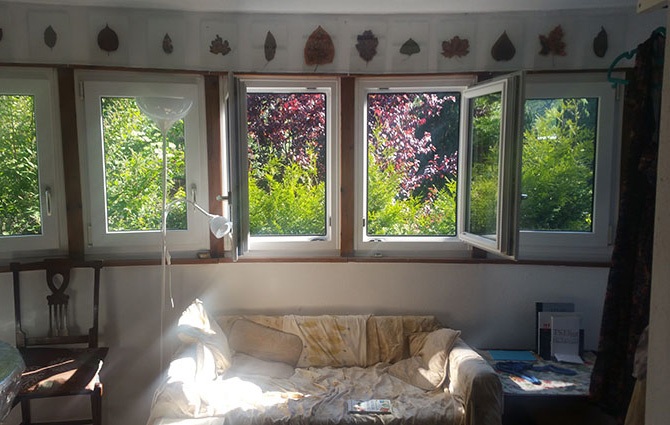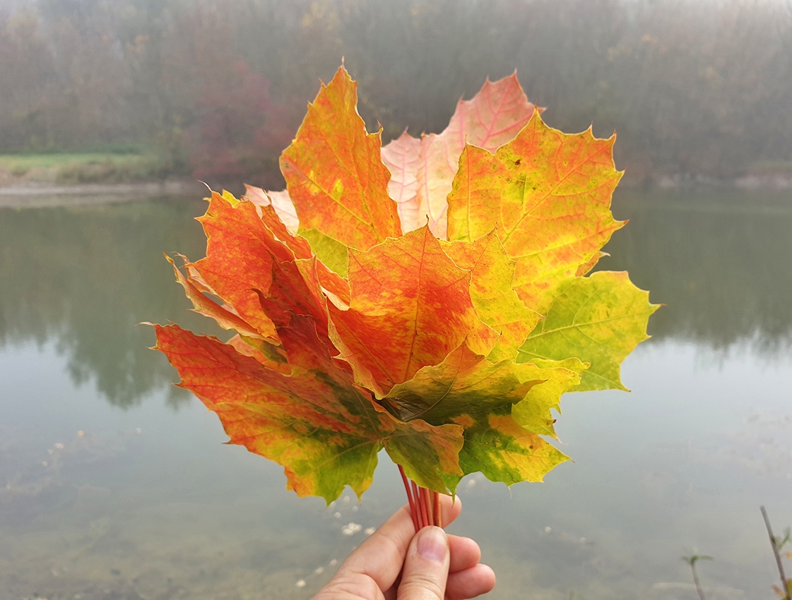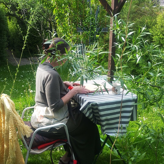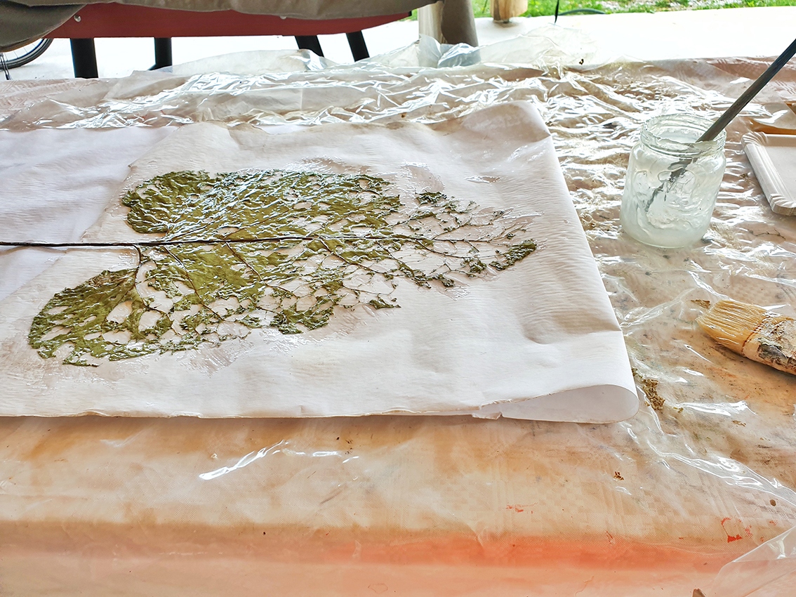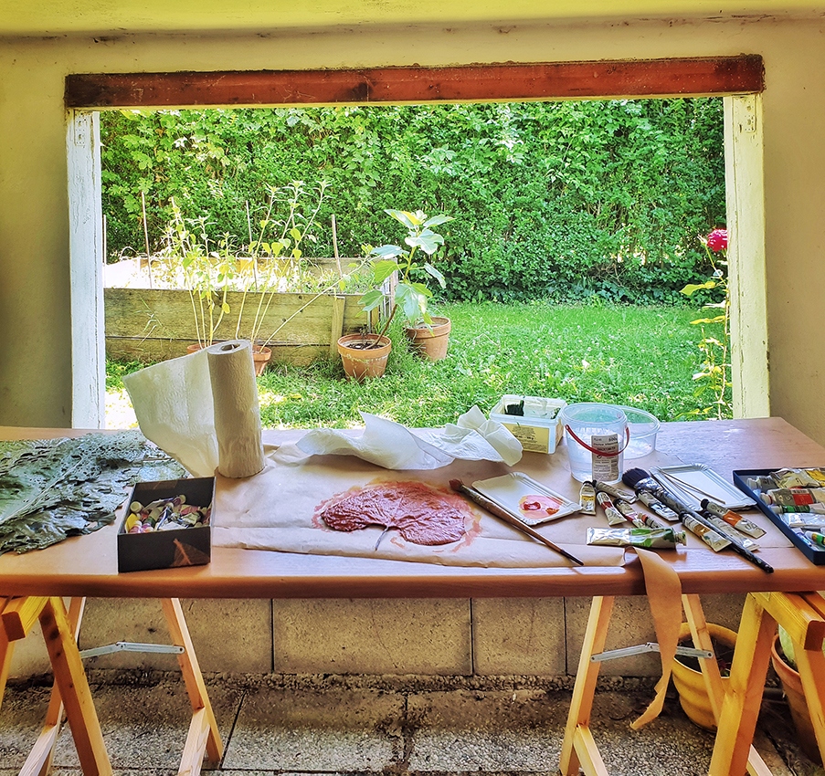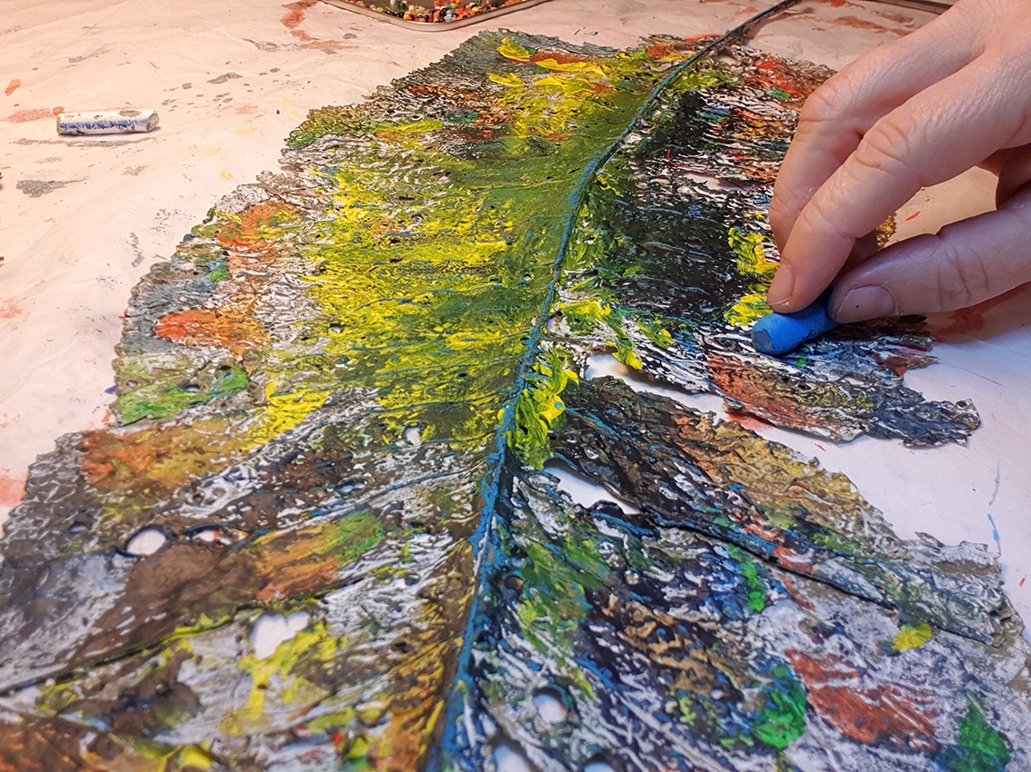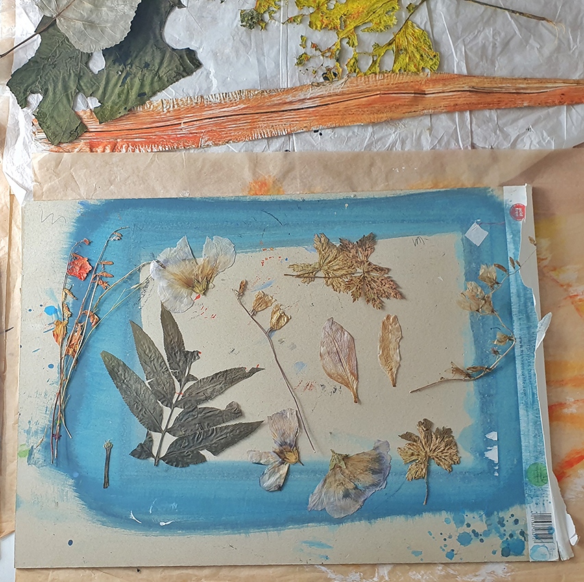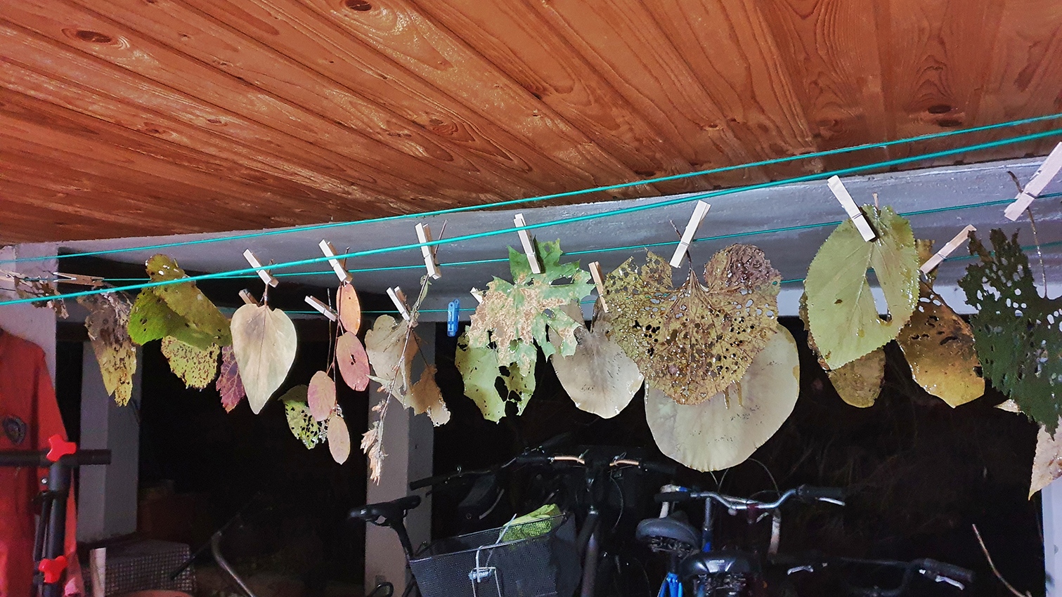 Die Künstlerin lebt in unmittelbarer Nähe der Klosterneuburger Donau-Au. Dort sammelt sie unterschiedliche Blätter, die das Ausgangsmaterial für ihre Arbeit bilden. Sie trocknet, presst und bearbeitet sie mit Acryl, Garn und Perlen.