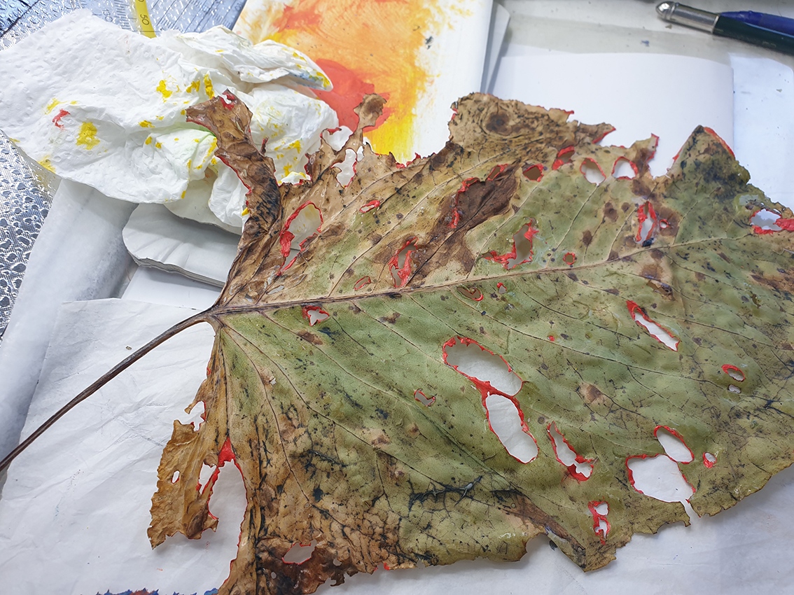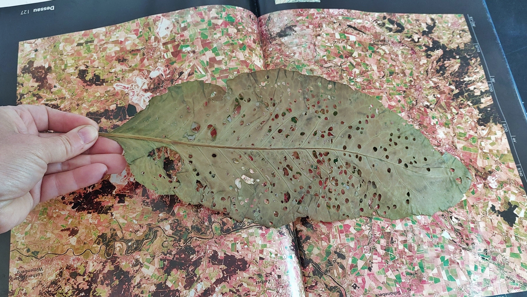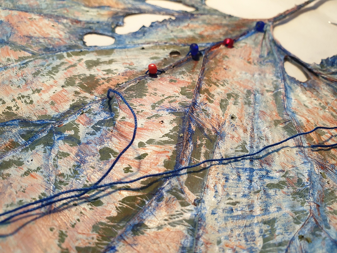 It’s not uncommon for the threads that stretch across the leaf, crossing and branching, to resemble the roads and paths of a map. Often the leaves have holes that are outlined with red paint and then look like wounds.