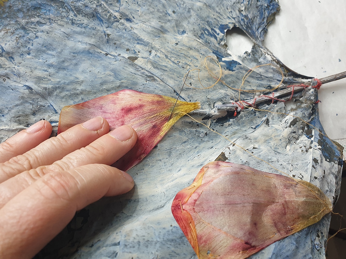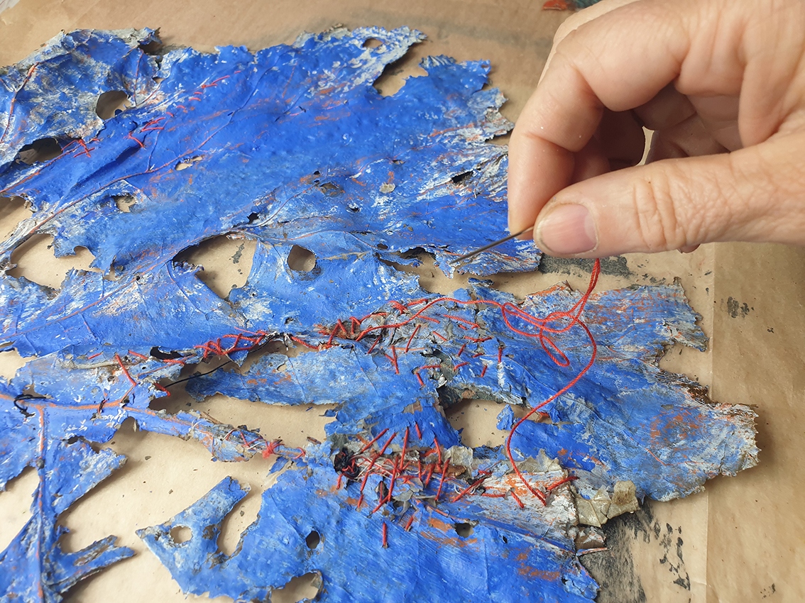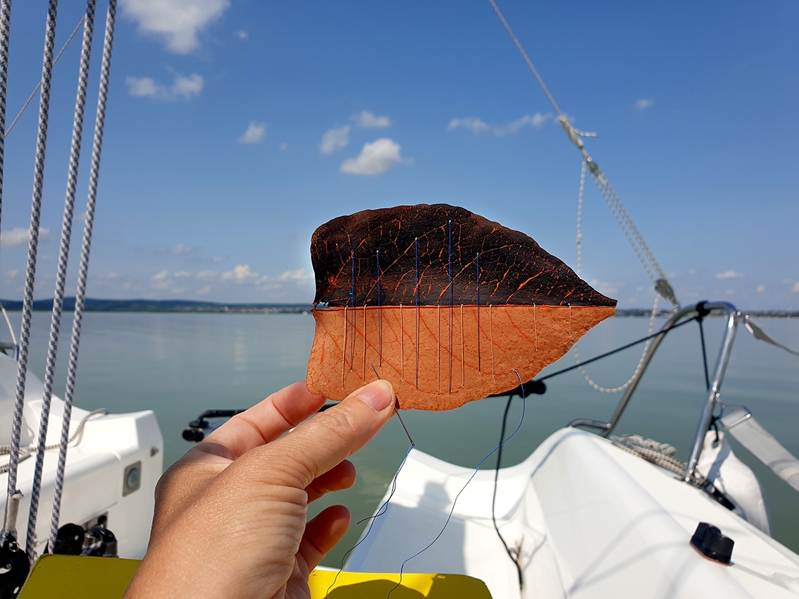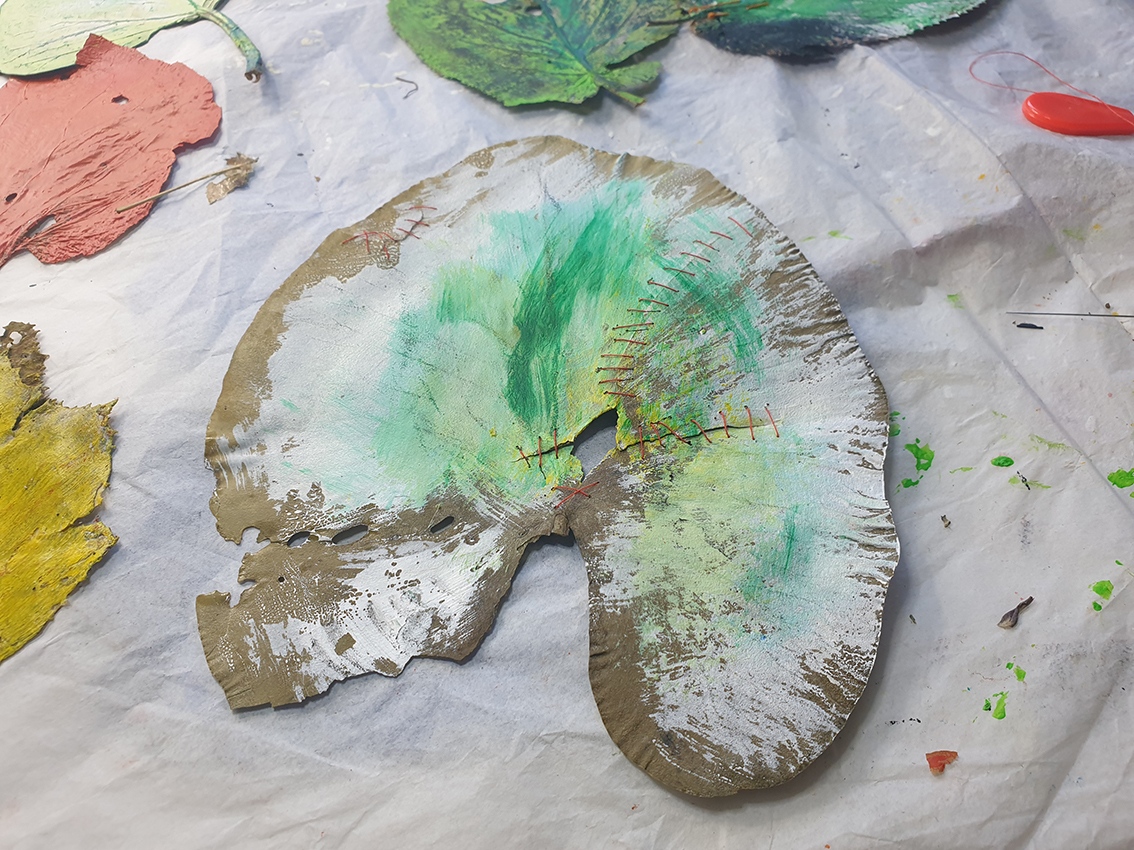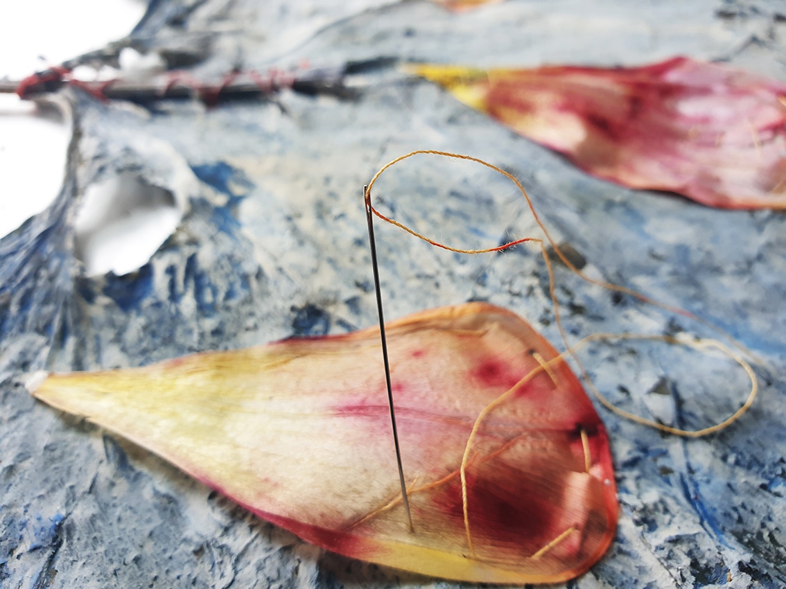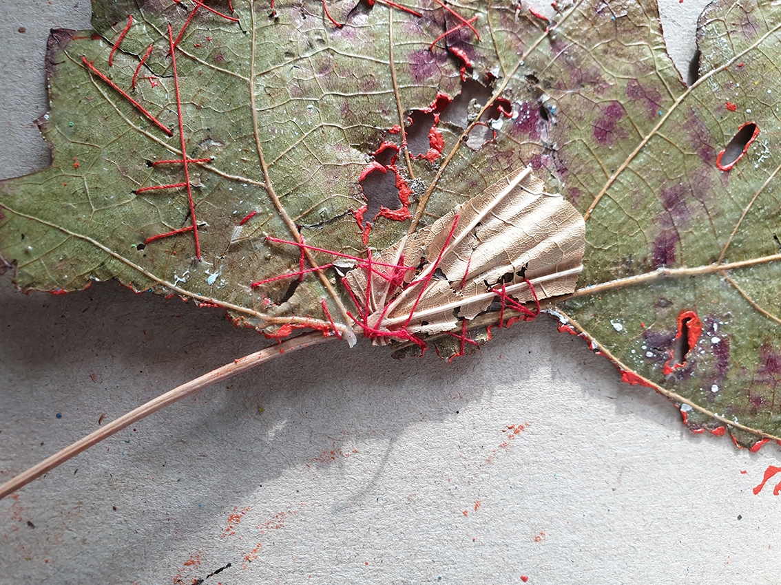 Durch den Prozess des Wanderns, Auswählens, Konservierens, Schmückens, Nähens und Reparierens von Blättern, entstehen neue Objekte, die widerspiegeln, wie wir mit der Umwelt umgehen sollten. Wenn ein Blatt an einer dünnen Stelle bricht, nähe ich es wieder zusammen, ähnlich einem chirurgischen Eingriff. Gebrochene Äste werden geschient, gerissene Häute genäht. Dieser Prozess ist für mich eine Art „Heilen der Natur“. Der meditative Prozess des Stickens ist eine heutzutage kaum mehr ausgeübte Tätigkeit und doch Teil unserer Herkunft.