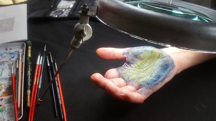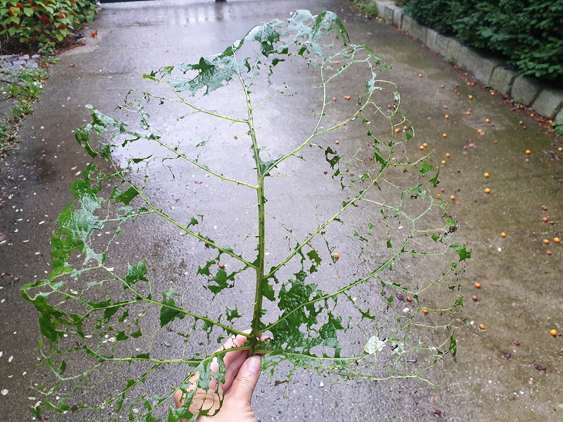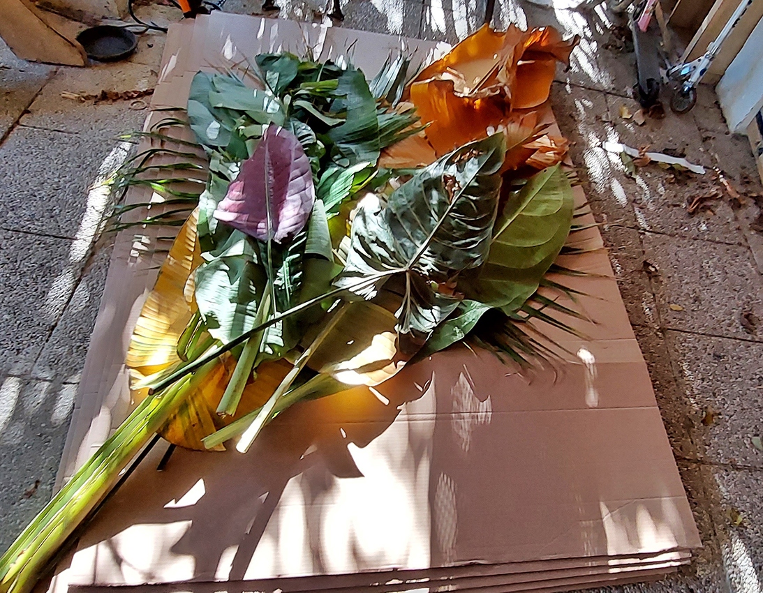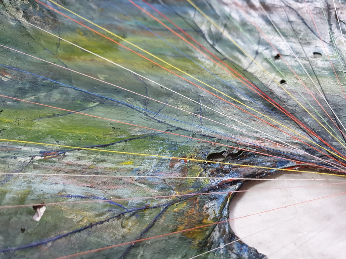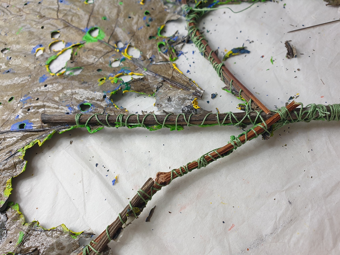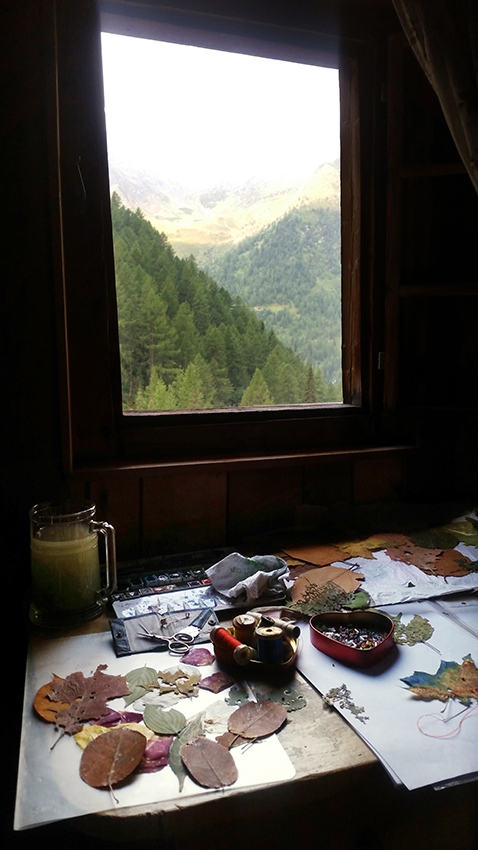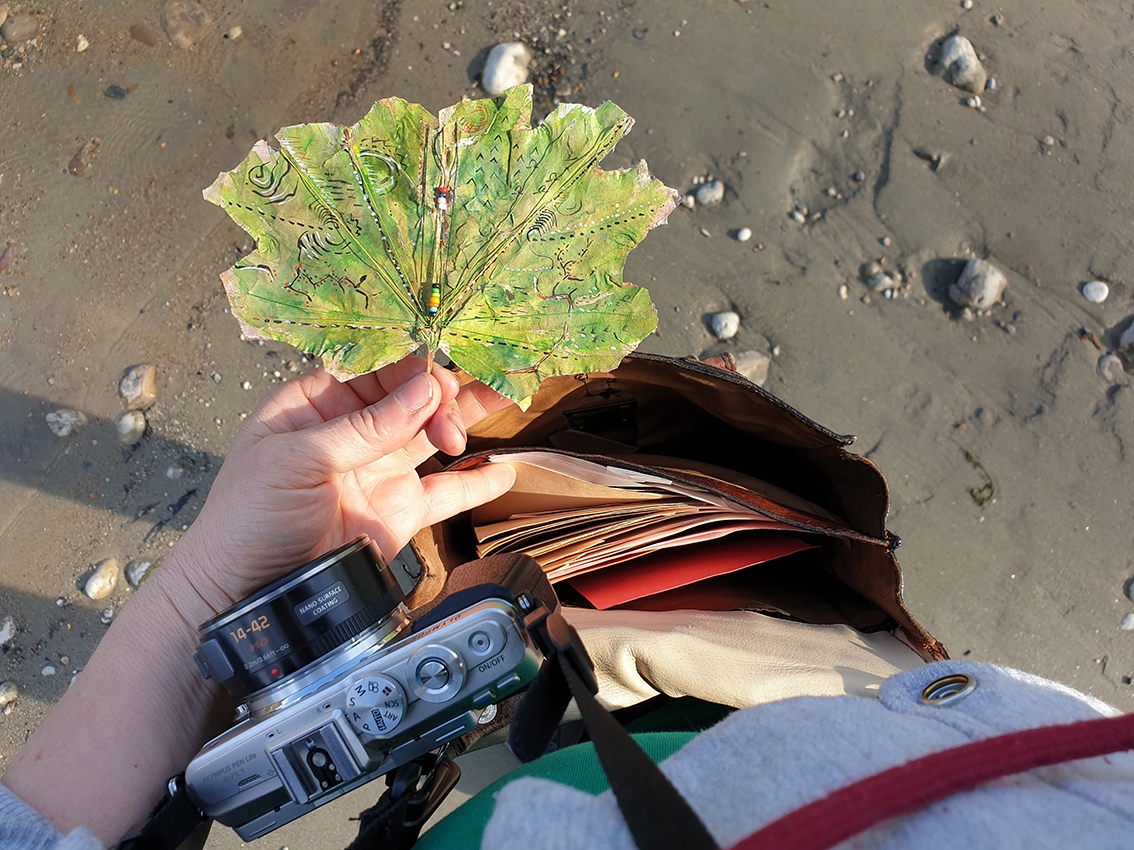 Durch den Prozess des Wanderns, Auswählens, Konservierens, Schmückens, Nähens und Reparierens von Blättern, entstehen neue Objekte, die widerspiegeln, wie wir mit der Umwelt umgehen sollten. Wenn ein Blatt an einer dünnen Stelle bricht, nähe ich es wieder zusammen, ähnlich einem chirurgischen Eingriff. Gebrochene Äste werden geschient, gerissene Häute genäht. Dieser Prozess ist für mich eine Art „Heilen der Natur“. Der meditative Prozess des Stickens ist eine heutzutage kaum mehr ausgeübte Tätigkeit und doch Teil unserer Herkunft.