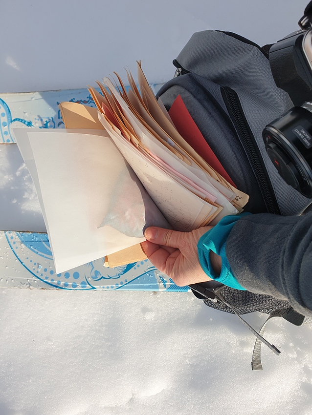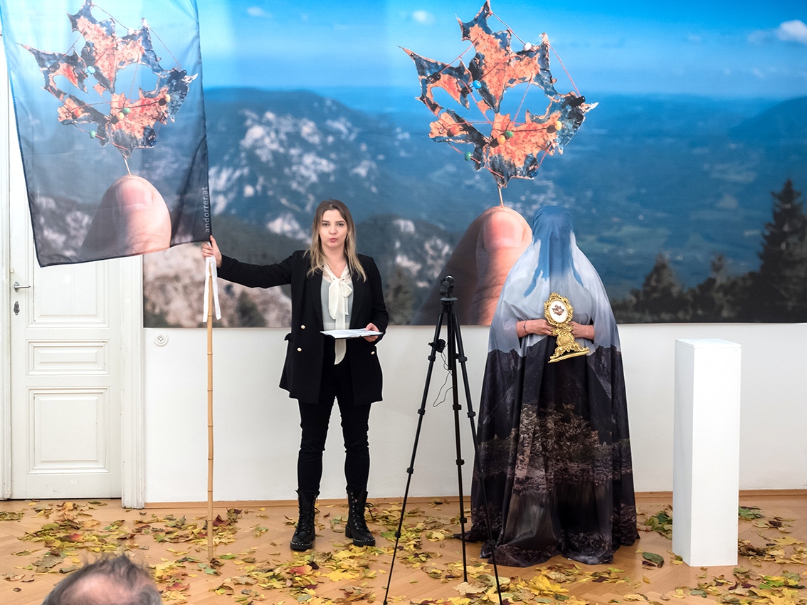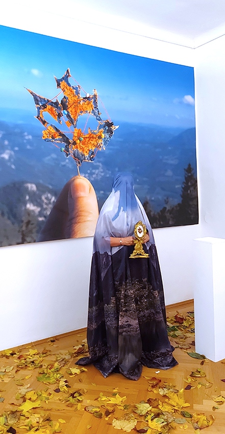 The artist takes leaves from nature, dries, preserves and works them with acrylic, yarn and glass beads. Particularly inspiring are leaves eaten away by snails, caterpillars and beetles, which become geological formations, a landscape and a legible map. When a leaf breaks in a thin place, it is sewn back together, similar to a surgical operation. Then Andorrer takes the BLATTSCAPES, like friends, on hikes and portrays them against changing scenery. By photographing the delicate artworks in the landscape, she documents how they relate to the light, weather, and surroundings. Aspects of the cinematic, being in nature and mindfulness become part of the work. With the exhibition of the GALLERY OF TRAVELING LEAVES in the landscape, a double relocalization takes place: landscape in the landscape, or microcosm in the macrocosm.