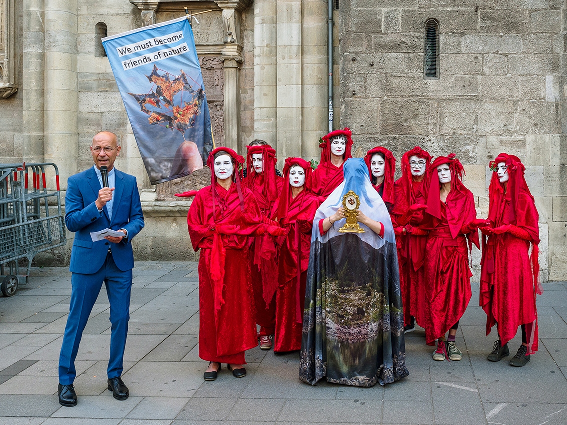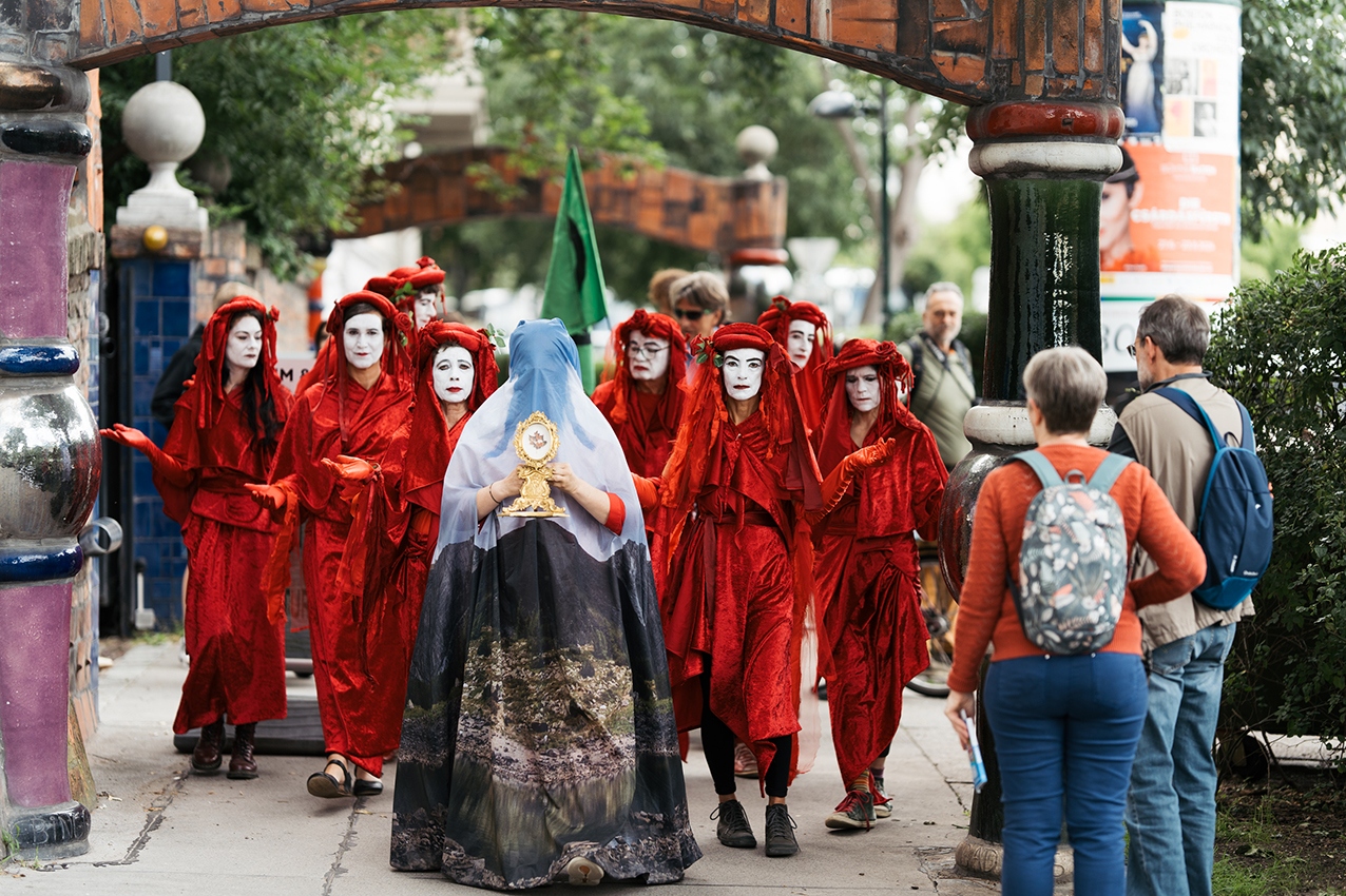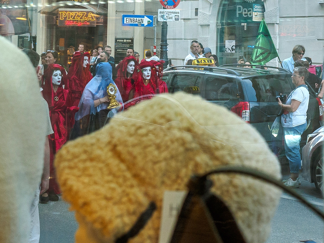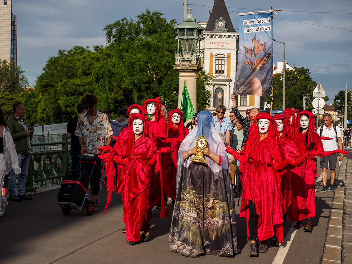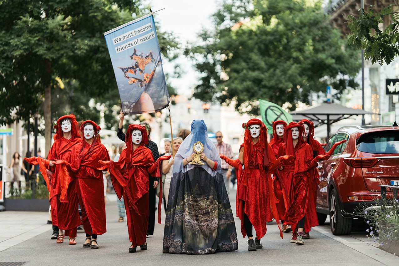 Die Aktionen werden ganz real von KlimaaktivistInnen unterstützt: Im Künstlerhaus Wien erschienen zum Beispiel rot gekleidete und auffällig geschminkte AkteurInnen knieend und betend, mit in unserer Kultur fast vollständig verschwundenen Gesten der Demut. Es handelte sich um die Red Rebels, eine Brigade der Klimaaktivisten XR Extinction Rebellion und Performance-Aktivistengruppe, die, von London ausgehend, im öffentlichen Raum und international auf die globale Umweltkrise aufmerksam macht mit eindrucksvollen, nonverbalen Prozessionen und Tableaus.