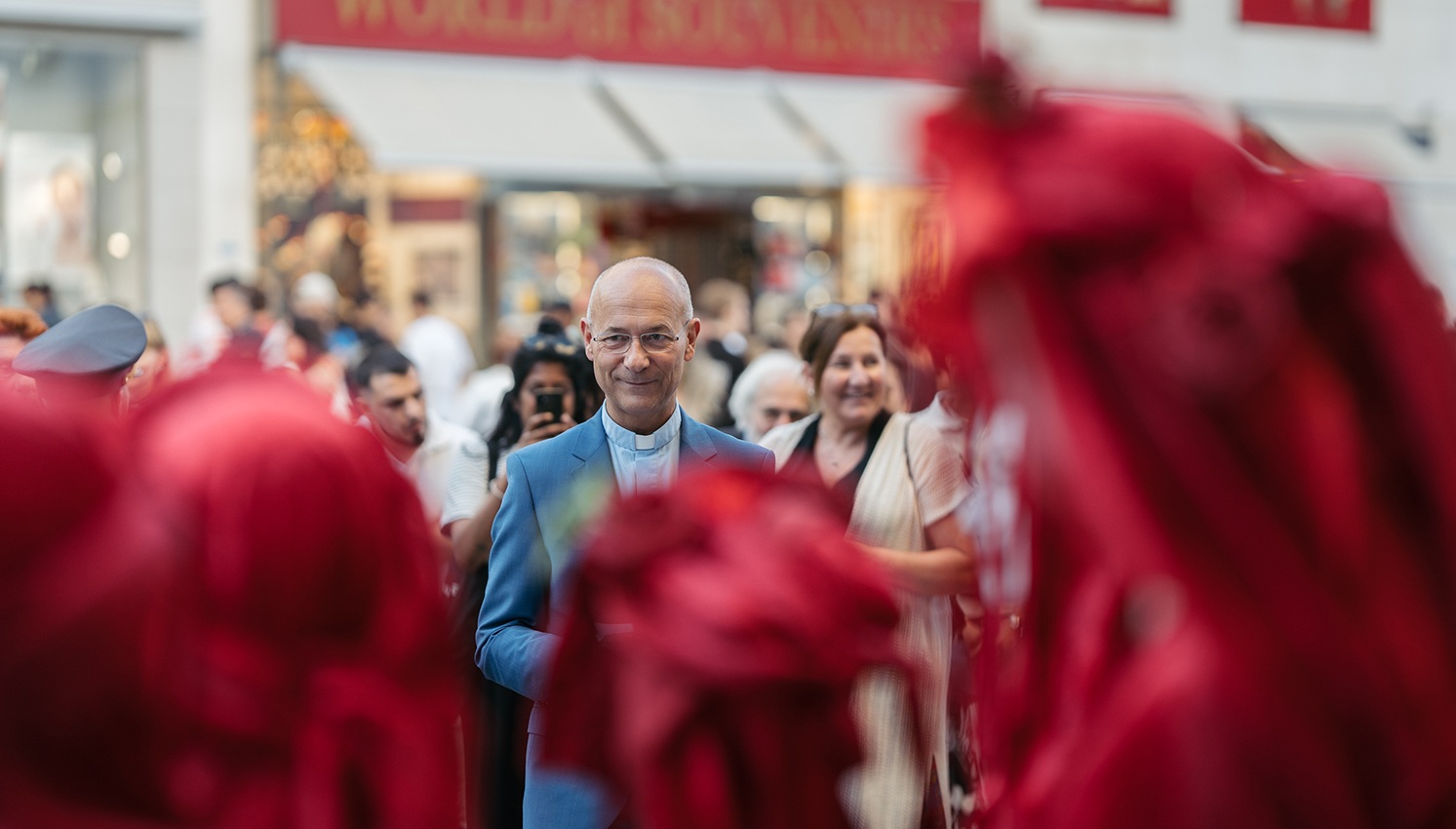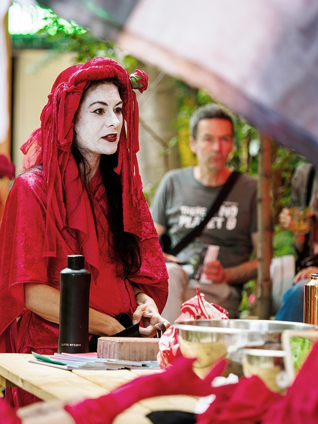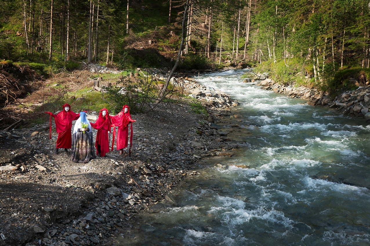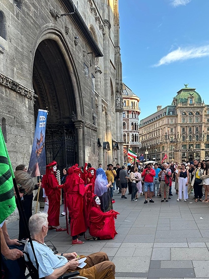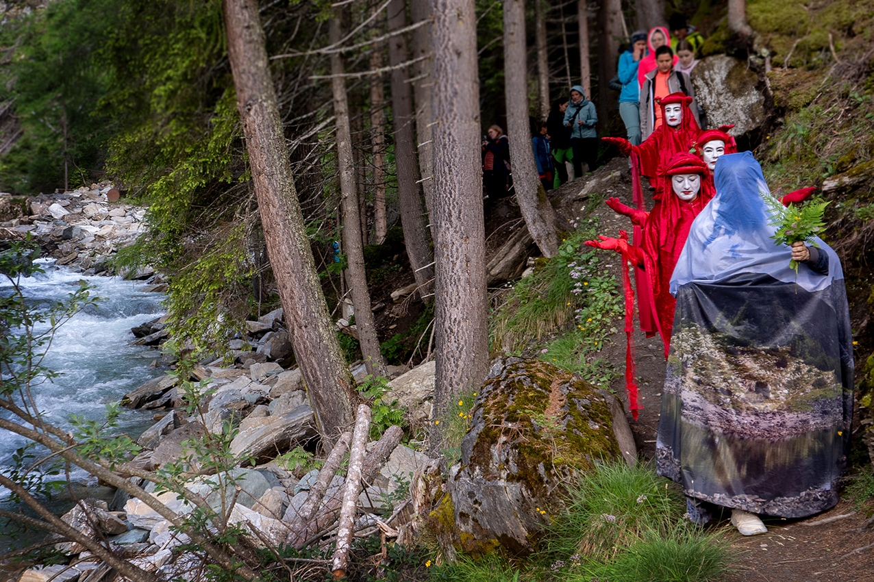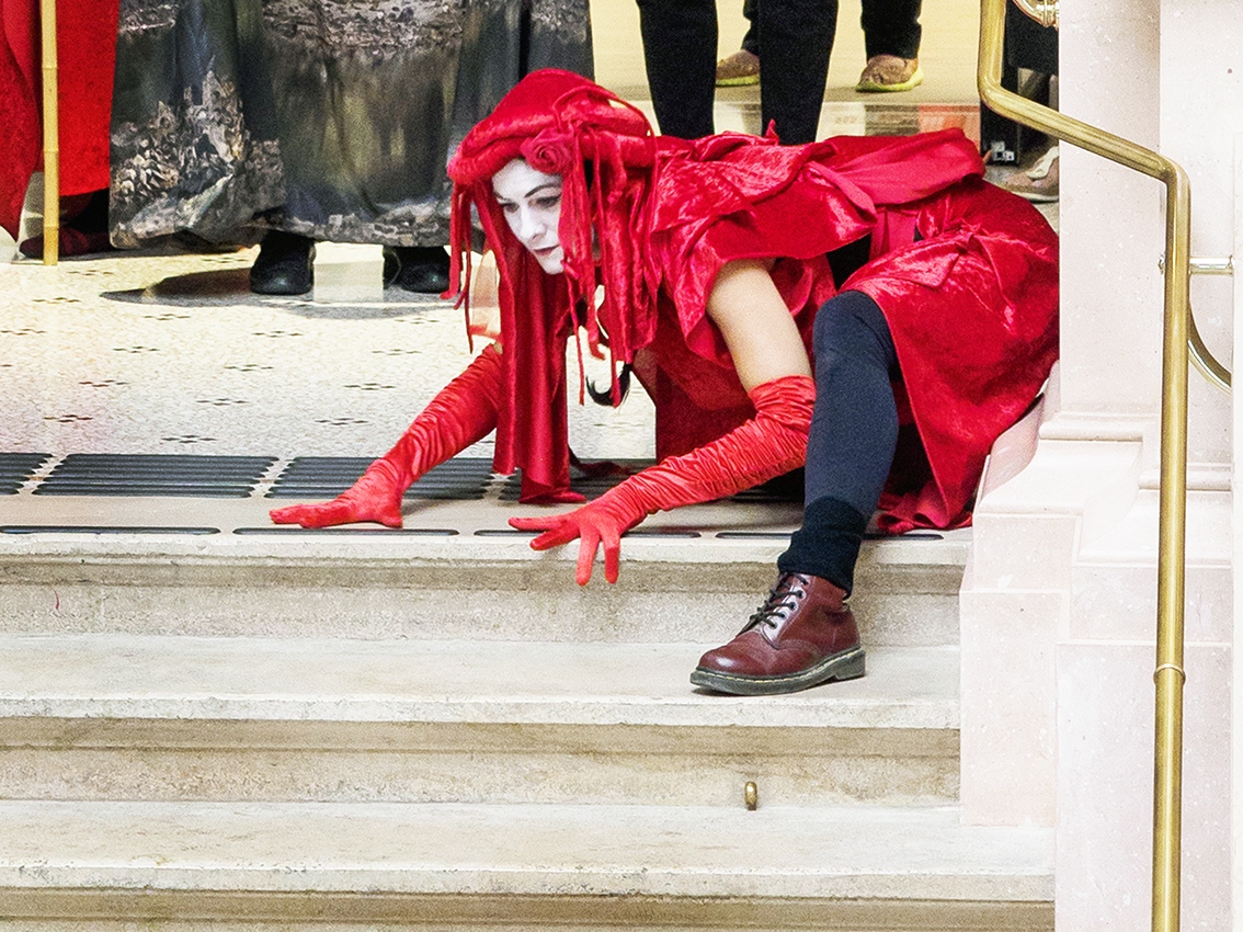 Die Aktionen werden ganz real von KlimaaktivistInnen unterstützt: Im Künstlerhaus Wien erschienen zum Beispiel rot gekleidete und auffällig geschminkte AkteurInnen knieend und betend, mit in unserer Kultur fast vollständig verschwundenen Gesten der Demut. Es handelte sich um die Red Rebels, eine Brigade der Klimaaktivisten XR Extinction Rebellion und Performance-Aktivistengruppe, die, von London ausgehend, im öffentlichen Raum und international auf die globale Umweltkrise aufmerksam macht mit eindrucksvollen, nonverbalen Prozessionen und Tableaus.