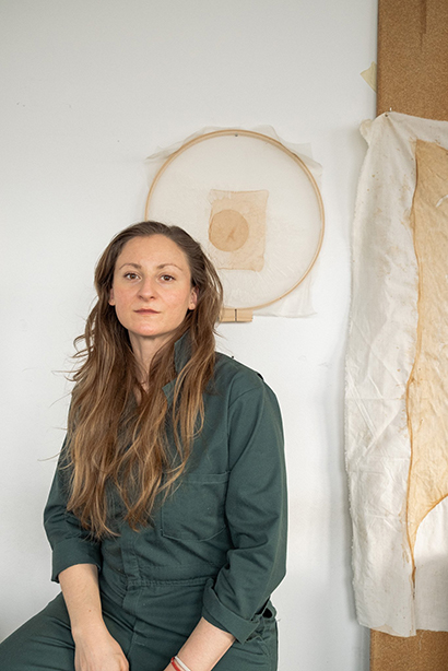 Monica C. LoCascios Arbeit spiegelt ihre fortlaufende Forschung zu endosymbiotischer Evolution, epigenetischem Gedächtnis und reproduktiver Arbeit wider. Die gehäkelten Werke verwandeln wiederverwertete Schnüre (idealerweise aus den Sammlungen verstorbener Personen) in Stücke, die an symbiotische Organismen und menschliche Organe wie Flechten, Lungen und Plazenten erinnern. Auch für die Stickereien werden wiederverwertete Schnüre verwendet, allerdings werden sie aus bakterieller Zellulose (auch bekannt als SCOBYs) hergestellt, die von der Künstlerin kultiviert wird. Sie dienen als Meditationen über die porösen Grenzen des Selbst – was gehört mir und was bin ich, wenn der menschliche Körper mehr bakterielle DNA als menschliche enthält? Was können wir aus der symbiotischen Natur unserer alten Evolutionsgeschichte lernen?